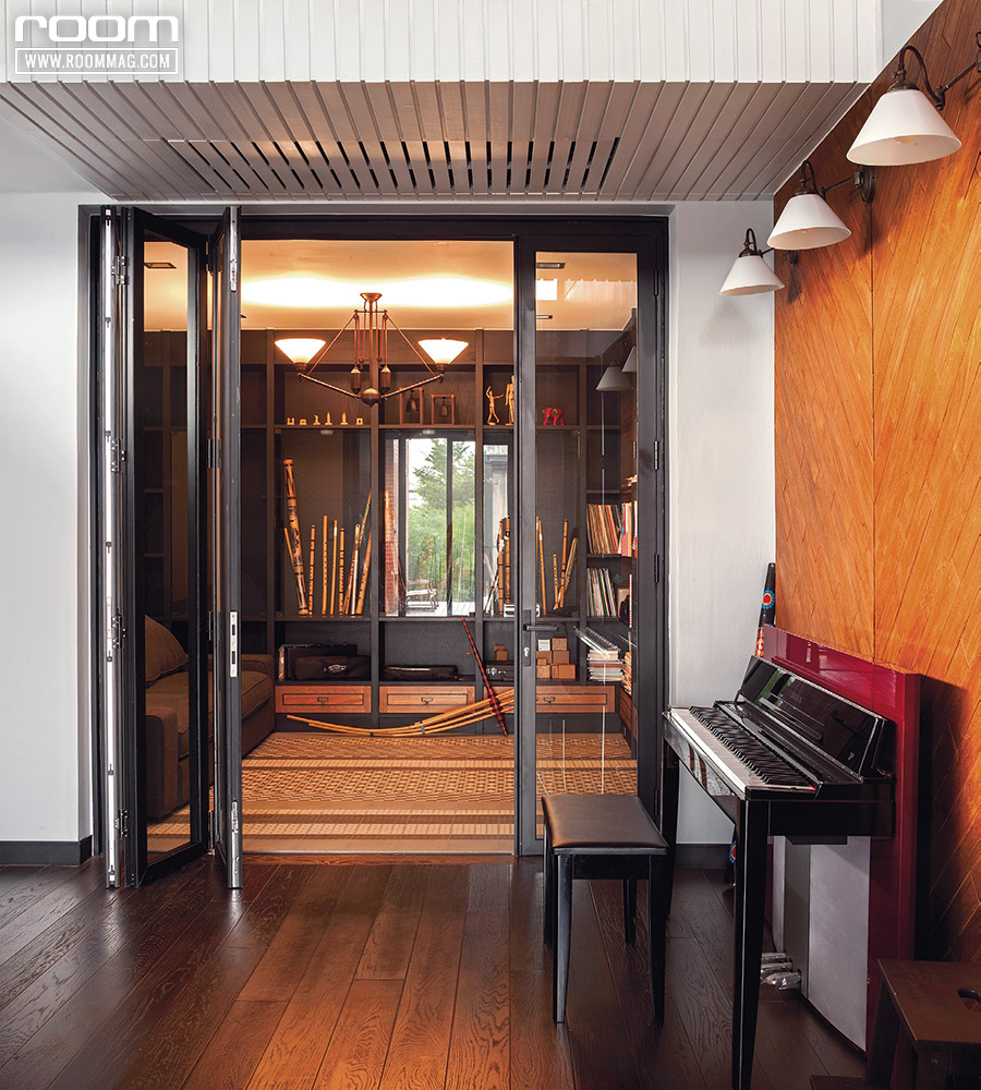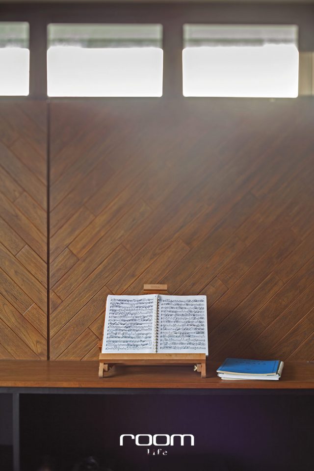 ห้องดนตรีมีการแบ่งพื้นที่ด้วยประตูบานเฟี้ยมและวัสดุปูพื้น ส่วนท่ีปูด้วยกระเบื้องจัดให้เป็นห้องเก็บเครื่องดนตรีต่างๆโชว์ไว้ในตู้กระจก ด้านนอกปูพื้นไม้แบ่งสัดส่วนเป็นพ้ืนที่ซ้อมดนตรี มีการกรุผนังบางส่วนด้วยไม้ลายก้างปลาให้เกิดความน่าสนใจ และใช้วิธีการตีไม้ระแนงบนเพดานเพื่อปิดช่องเครื่องปรับอากาศให้สวยงาม