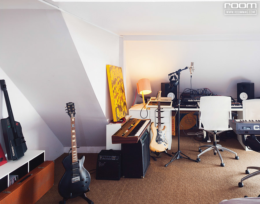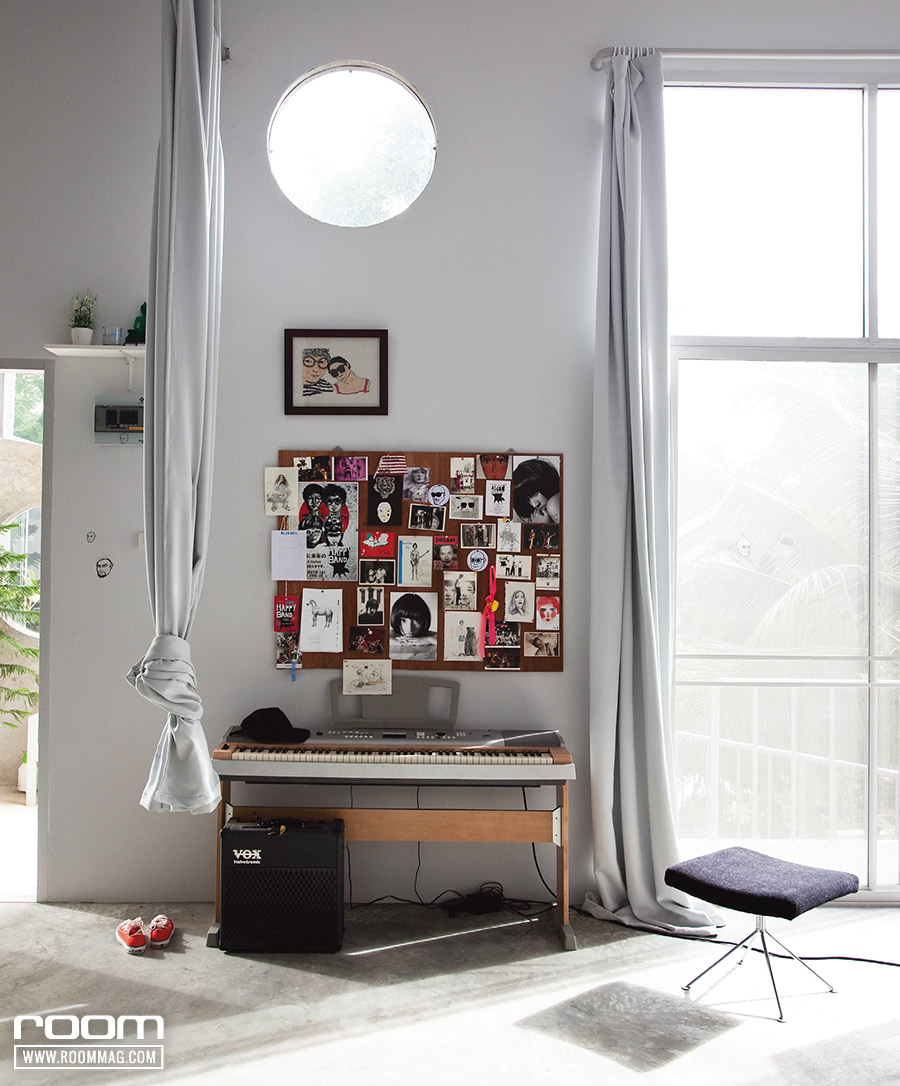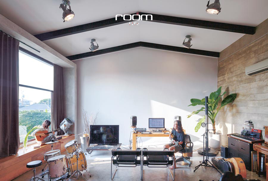 ฟังก์ชันที่เป็นมากกว่าพื้นที่อยู่อาศัย มุมสตูดิโอขนาดย่อม พรั่งพร้อมด้วยเครื่องดนตรีนานาชนิดที่เรียกได้ว่าครบวง โดยมีฉากหลังเป็นผนังสีขาวเรียบ ๆ เตรียมไว้ให้กลายเป็น “Limbo” หรือฉากถ่ายภาพ สเปซนี้จึงยืดหยุ่นและสามารถปรับเปลี่ยนการใช้งานได้หลากหลายตามกิจกรรมหมุนเวียนเกิดขึ้นสม่ำเสมอ ราวกับว่าบ้านหลังนี้ออกแบบมาให้พร้อมกับการเปลี่ยนแปลงอยู่ตลอดเวลา