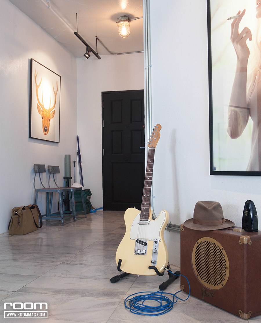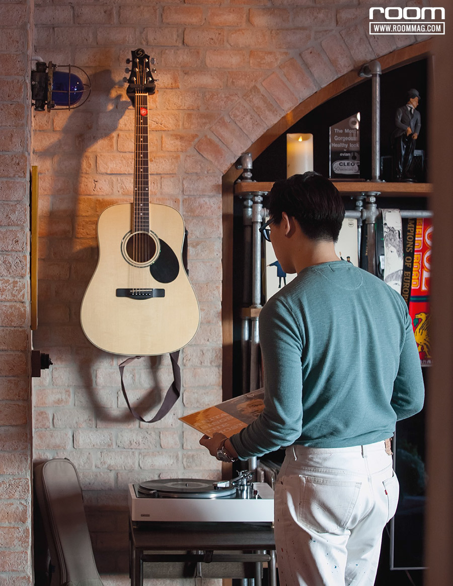 มุมดนตรี ที่เป็นทั้งมุมสำหรับเครื่องดนตรี และการฟังดนตรีแบบอะนาล็อกอย่างแผ่นเสียง เสน่ห์คือการได้จับสัมผัส และเลือกสรรเพลงแต่ละอัลบั้มด้วยมือ การแต่งห้องก็เช่นกัน ห้องสไตล์ย้อนยุคก็ช่วยเสริมบรรยากาศให้อบอวลด้วยวันเวลาของวันวาน ด้วยผนังอิฐเปลือยโชว์พื้นผิว และงานกรุเหล็กสไตล์อินดัสเทรียล