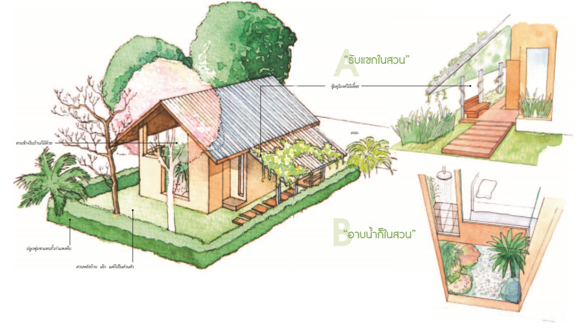 ตัวบ้านวางเยื้องมาด้านหน้าที่ดิน เพื่อให้เกิดที่ว่างด้านหลังให้มากที่สุดสำหรับทำสวน นอกจากสวนภายนอกแล้ว ผมยังออกแบบให้สวนเลื้อยเข้ามาสัมพันธ์กับพื้นที่ภายในด้วย ( ดูแปลนประกอบ) เพื่อให้รู้สึกใกล้ชิดธรรมชาติมากที่สุด โดยทางเข้าด้านหน้าออกแบบเป็นมุมนั่งเล่น-รับแขกเล็กๆอยู่ภายนอกบ้าน เมื่อเข้ามาภายในบ้านจะพบส่วนอเนกประสงค์ ใช้เตรียมอาหาร รับประทานอาหาร รวมถึงนั่งทำงานได้ด้วย ถัดไปเป็นห้องน้ำ ซึ่งแยกส่วนอาบน้ำฝักบัวไว้เป็นสัดส่วนและสามารถชมวิวสวนได้ ส่วนห้องนอนที่อยู่ด้านในก็อยู่ใกล้สวนหย่อมเช่นกัน สำหรับหน้าบ้านทำเป็นแปลงพืชผักสวนครัวใช้ประโยชน์ได้ บางทีต้นไม้ที่ปลูกยังใช้แทนรั้วบ้านได้ด้วยครับ