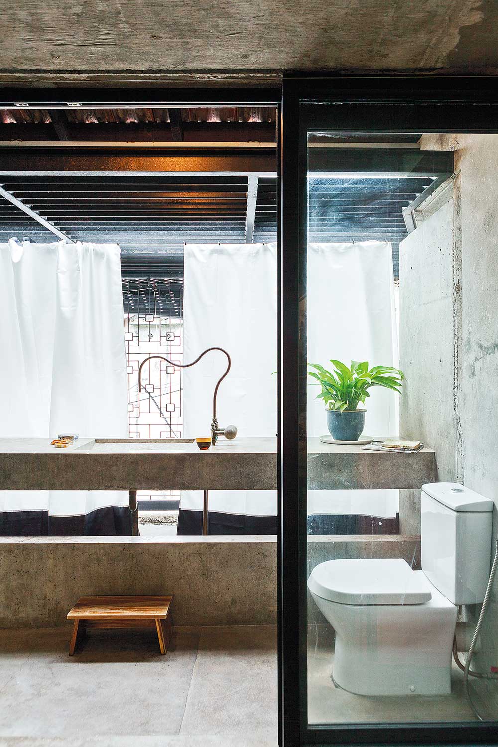 ประโยชน์ใช้สอยของม่านในส่วนนี้ก็เพื่อควบคุมแสงและบังสายตาจากภายนอก ควรเน้นสีม่านที่สว่างและเข้ากับโทนสีของกระเบื้องและสุขภัณฑ์ เช่น สีฟ้าอ่อน สีครีม เพื่อให้รู้สึกสบายไม่อึดอัดขณะเข้ามาใช้งาน ม่านที่ใช้ควรเป็นม่านปรับแสงหรือมู่ลี่ที่สามารถปรับระดับแสงได้ ดูเรียบง่าย สบาย และโปร่ง