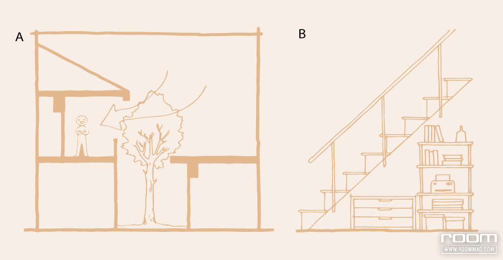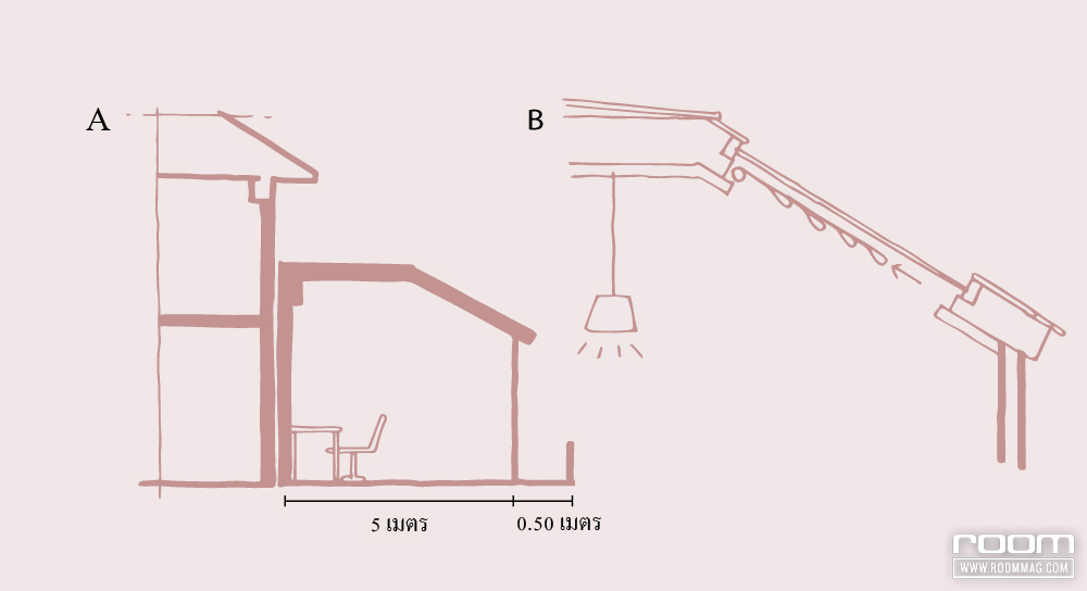 A เว้นระยะห่างระหว่างบ้านหลังเดิมและส่วนต่อเติมใหม่ประมาณ 1.50 – 2 เมตร เพื่อให้แสงสว่างและลมยังคงเข้ามาได้ถึงชั้นล่างของบ้านเดิม และเป็นช่องให้อากาศร้อนได้ระบายขึ้นด้านบนช่วยให้บ้านและออฟฟิศไม่ร้อนด้วย