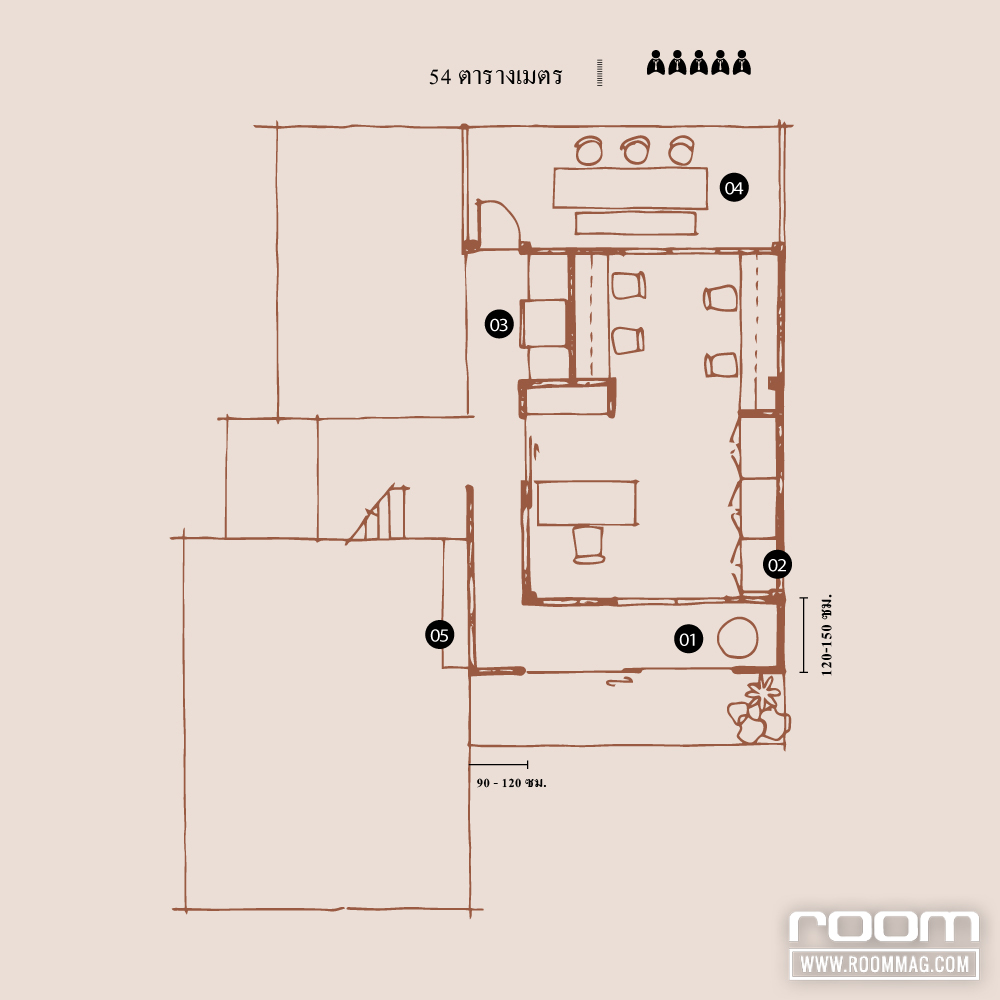 01 ร่นระยะห่างจากส่วนหน้าบ้านประมาณ 1.20 – 1.50 เมตร สำหรับเป็นทางสัญจรร่วมกันระหว่างส่วนออฟฟิศกับตัวบ้าน ทั้งนี้ควรกั้นพื้นที่ให้เป็นสัดส่วนเพื่อรักษาความเป็นส่วนตัวของกันและกัน ส่วนชานด้านหน้าที่มีขนาดกว้างขวางสามารถใช้เป็นส่วนพักคอยสำหรับบุคคลที่เข้ามาติดต่องาน