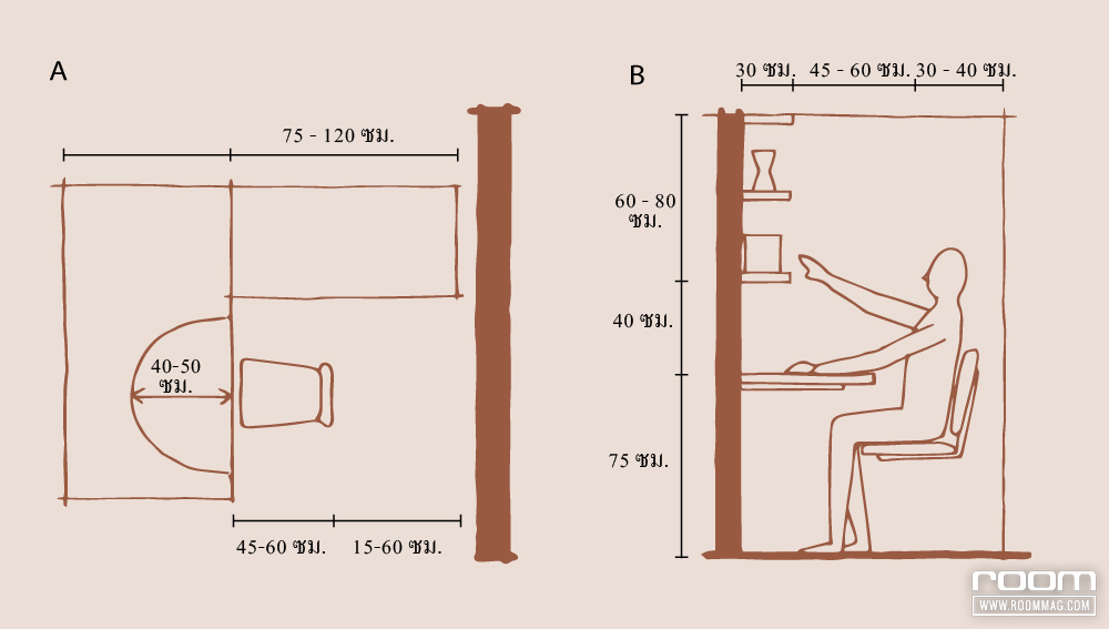 B มุมมองด้านข้าง (Side View) ของพื้นที่ทำงาน คำนึงถึงสรีระและระยะนั่งสบายขณะทำงาน โดยกำหนดให้โต๊ะทำงานมีความสูงจากพื้นประมาณ 75 เซนติเมตร และเว้นระยะห่างจากท็อปโต๊ะถึงตัวผู้นั่งอีก 40 เซนติเมตร ด้านบนไม่ลืมติดตั้งชั้นวางของเหนือโต๊ะทำงาน