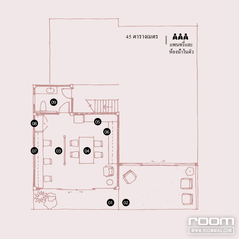 06 กั้นส่วนงานเอกสารและพื้นที่เก็บของที่ไม่ค่อยใช้งานบ่อยนักให้เป็นสัดส่วนค้นหาง่าย 07 แพนทรี่ 08 ห้องน้ำ