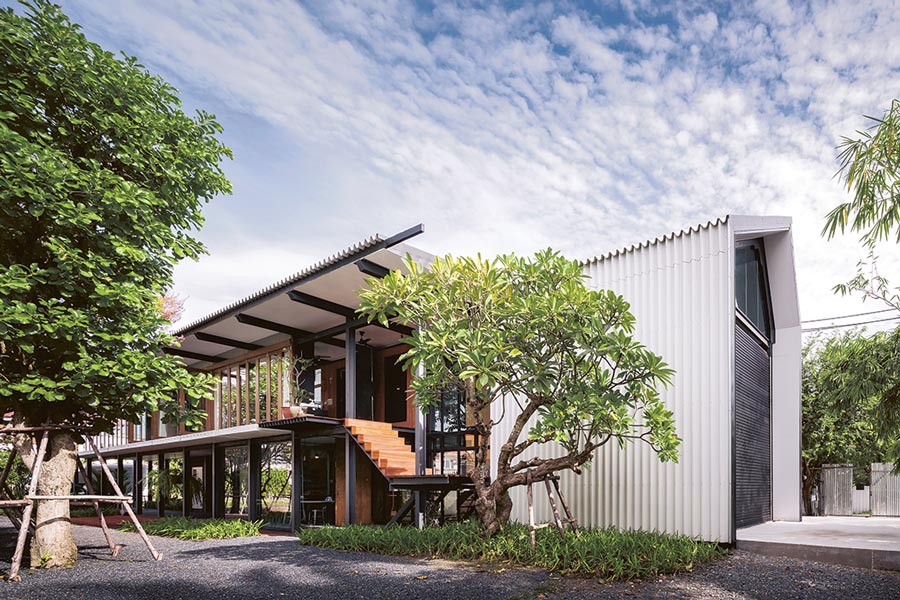 บ้านสตูดิโอ หลังนี้คุณอิ๋มเลือกรูปแบบสถาปัตยกรรมเหล็กที่ดูเบาลอยเหมาะกับสภาพอากาศในเมืองไทยเน้นความโปร่งโล่งมีช่องเปิดมากพอเพื่อระบายอากาศร้อน โดยออกแบบโครงสร้างเผื่อไว้สำหรับรับรองการใช้งานที่หลากหลายตั้งแต่เป็นอาคารสำนักงานทั้งหลัง เป็นบ้านพักอาศัยทั้งหลัง หรือทำเป็นสำนักงานชั้นล่างและบ้านพักอาศัยชั้นบน