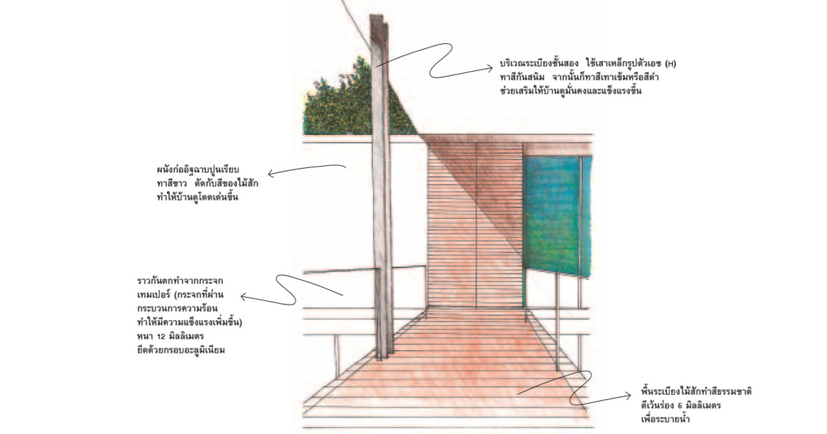 - ผนังก่ออิฐฉาบปูนเรียบ ทาสีขาว ตัดกับสีของไม้สัก ทำให้บ้านดูโดดเด่นขึ้น