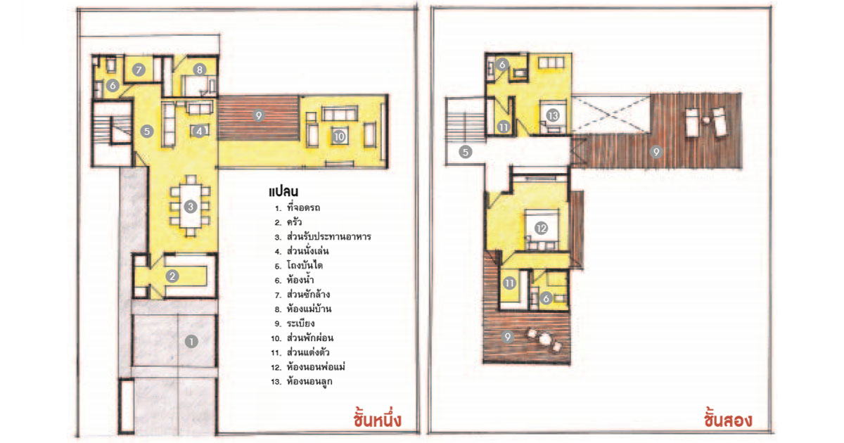 แต่สำหรับโจทย์การออกแบบ “บ้านในฝัน” ฉบับนี้ กำหนดให้เป็นบ้านของคู่สามีภรรยาที่มีลูกชายวัยรุ่นหนึ่งคน เป็นครอบครัวเดี่ยวอยู่ในกรุงเทพฯ พื้นที่ชั้นหนึ่งเริ่มจากทางเข้าบ้านจะพบที่จอดรถซึ่งสามารถจอดได้ 2 คัน วางส่วนครัวไว้ด้านหน้าบ้านเพื่อความสะดวกในการขนของเข้าบ้าน ต่อมาจะพบส่วนรับประทานอาหารและส่วนนั่งเล่น ซึ่งต่อเนื่องเป็นพื้นที่เดียวกัน เปิดมุมมองสู่สวนกลางบ้าน ถัดไปจะมีทางเดินกระจกใสเชื่อมไปสู่ส่วนพักผ่อน ส่วนด้านหลังบ้านทำเป็นห้องแม่บ้าน ส่วนซักล้าง และห้องน้ำเผื่อไว้ด้วย ชั้นสองหากทำเป็นพื้นที่โล่งเปิดรับลมหมดก็อาจมากเกินไป จึงยกห้องนอนมาไว้ชั้นบน (ซึ่งน่าจะถูกใจคนไทยมากกว่าด้วย) เป็นห้องนอนพ่อแม่และห้องนอนลูกชาย แต่ละห้องเพิ่มความพิเศษด้วยระเบียงขนาดใหญ่ที่เปิดโล่งสู่บรรยากาศภายนอกคล้ายอยู่ใต้ถุนแต่วิวดีกว่า รับลมมากกว่า วัสดุที่ใช้ก็เรียบง่าย เป็นผนังฉาบเรียบทาสี อาจเน้นผนังบางส่วนด้วยการกรุไม้