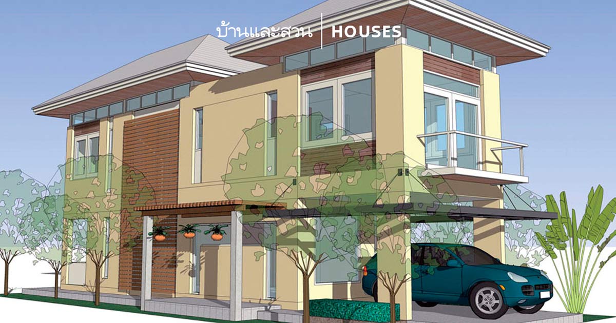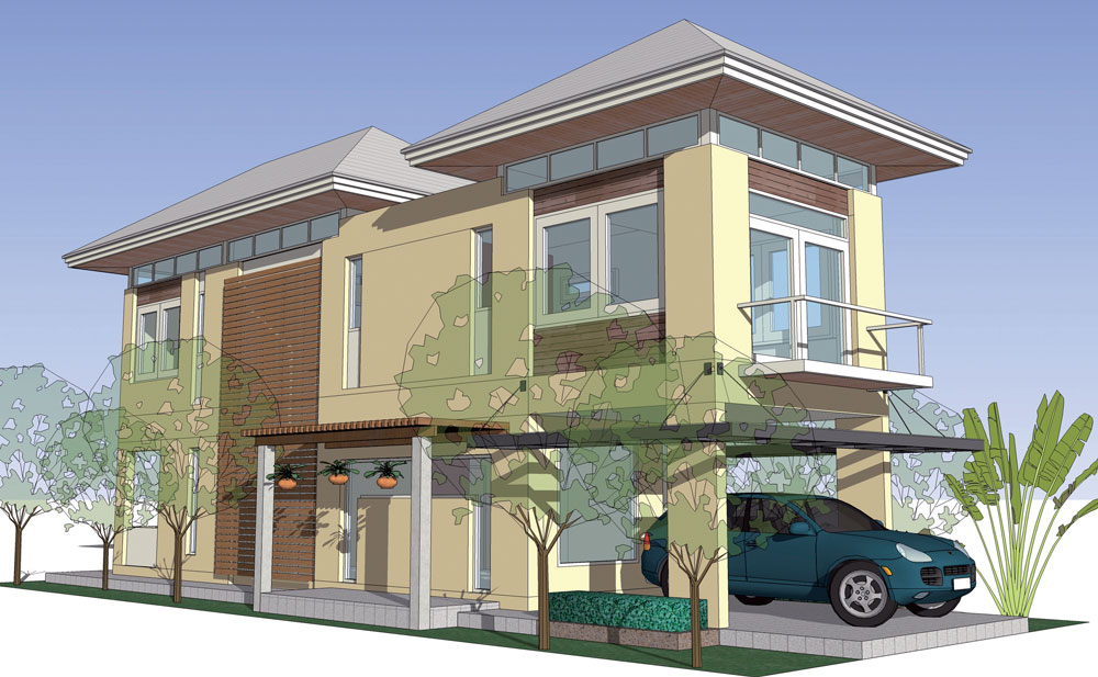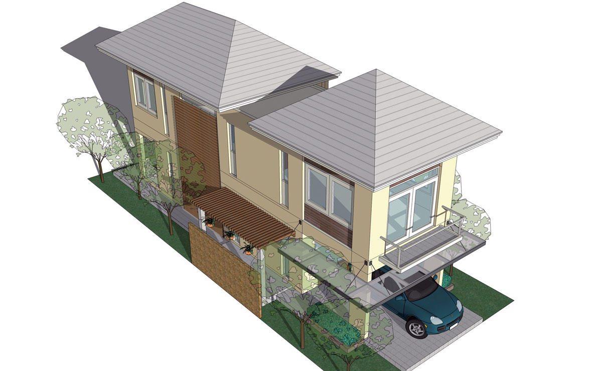 ชั้นล่างประกอบด้วย ที่จอดรถ 1 คัน ห้องรับแขก-พักผ่อน ห้องน้ำแขก ห้องรับประทานอาหาร พร้อมส่วนเตรียมอาหารที่แยกส่วนครัวไทยต่างหาก เพื่อป้องกันกลิ่นเข้ามารบกวนภายในบ้านขณะปรุงอาหาร ชั้นสองเป็นห้องนอนใหญ่มีห้องน้ำพร้อมส่วนแต่งตัว ส่วนห้องนอนลูกก็มีห้องน้ำในตัวเช่นกัน ทางเดินเชื่อมระหว่างห้องนอนออกแบบเป็นเหมือนสะพาน เพื่อให้ดูน่าสนใจ และยังเป็นการเปิดช่อง open well เพื่อรับแสงสว่างและระบายอากาศระหว่างชั้นบนกับชั้นล่างอีกด้วย บ้านหลังนี้มีพื้นที่ใช้สอยประมาณ 130 ตารางเมตร ปลูกสร้างในที่ดินขนาด 40 ตารางวา หน้ากว้างตั้งแต่ 8 เมตร ลึก 20 เมตร ขึ้นไป ราคาค่าก่อสร้างโดยประมาณ 1.3 –1.5 ล้านบาท