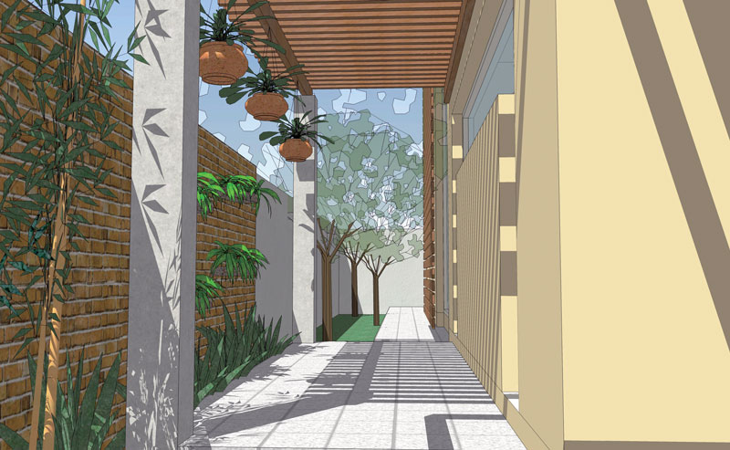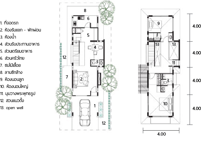 ออกแบบบ้านหลังนี้โดยใช้แปลนแบบตึกแถว ช่วงระยะกว้างเสา 4 เมตร ลึก 16 เมตร โดยออกแบบเป็นบ้านสองชั้น ขนาดห้องนอน 2 ห้อง ห้องน้ำ 3 ห้อง มีพื้นที่ใช้สอยที่ตอบสนองการใช้ชีวิตในปัจจุบันได้อย่างครบครัน เนื่องจากพื้นที่มีน้อย การจัดสวนแนวตั้งจึงเหมาะสมและจำเป็นมาก ไม่ว่าจะเป็นสวนแขวน สวนกระบะริมน้ำ ที่จะช่วยเพิ่มสีเขียวให้กับบ้าน และลดความแข็งกระด้างของสิ่งก่อสร้างที่อยู่ในที่แคบๆได้