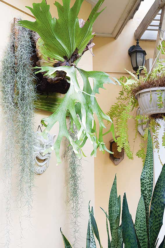 ไม้แขวนหลายชนิดมีรูปทรงที่มีเอกลักษณ์ เราสามารถนำพรรณไม้เหล่านี้มาตกแต่งผนังในสวน ในบ้าน หรือตามต้นไม้ใหญ่ก็กลายเป็นประติมากรรมชิ้นงามที่รังสรรค์ขึ้นจากธรรมชาติ เพิ่มความน่าสนใจด้วยกรอบไม้หรือฉากหลังในโทนสีต่าง ๆ พรรณไม้แนะนำ ได้แก่ เฟินชายผ้าสีดา เฟินเขากวางตั้ง ริปซาลิสไข่มุก เป็นต้น