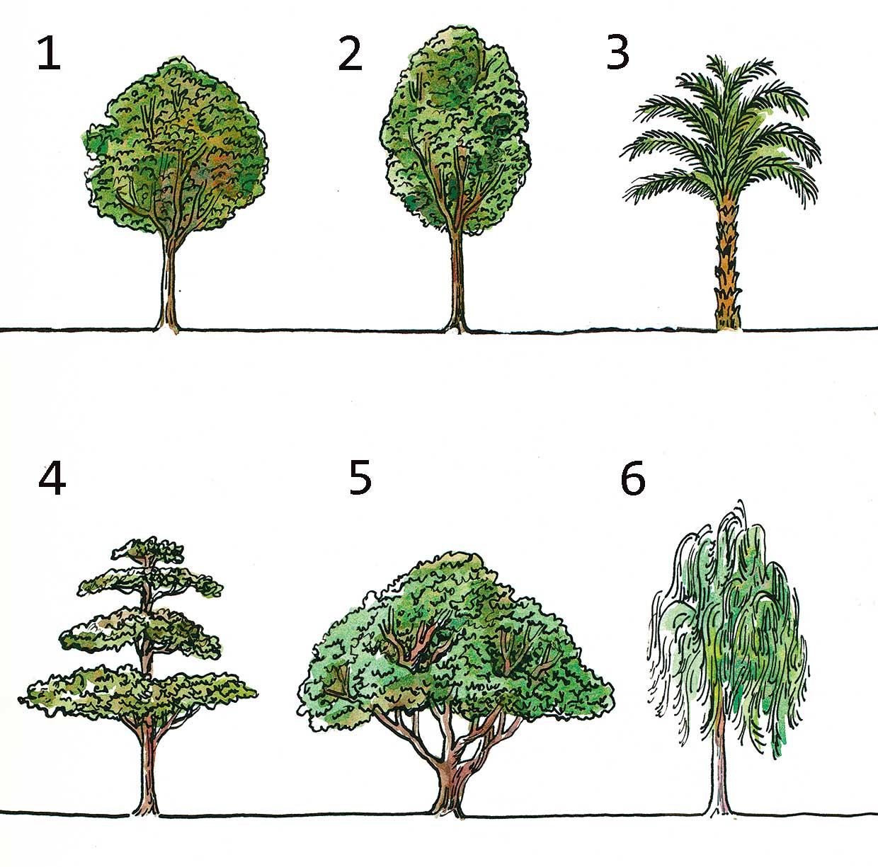 1. ทรงกลม ได้แก่ กระทิง พิกุล ตีนเป็ดน้ำ มะขาม มะม่วง ขี้เหล็ก ชงโค เป็นต้น
