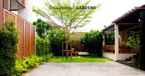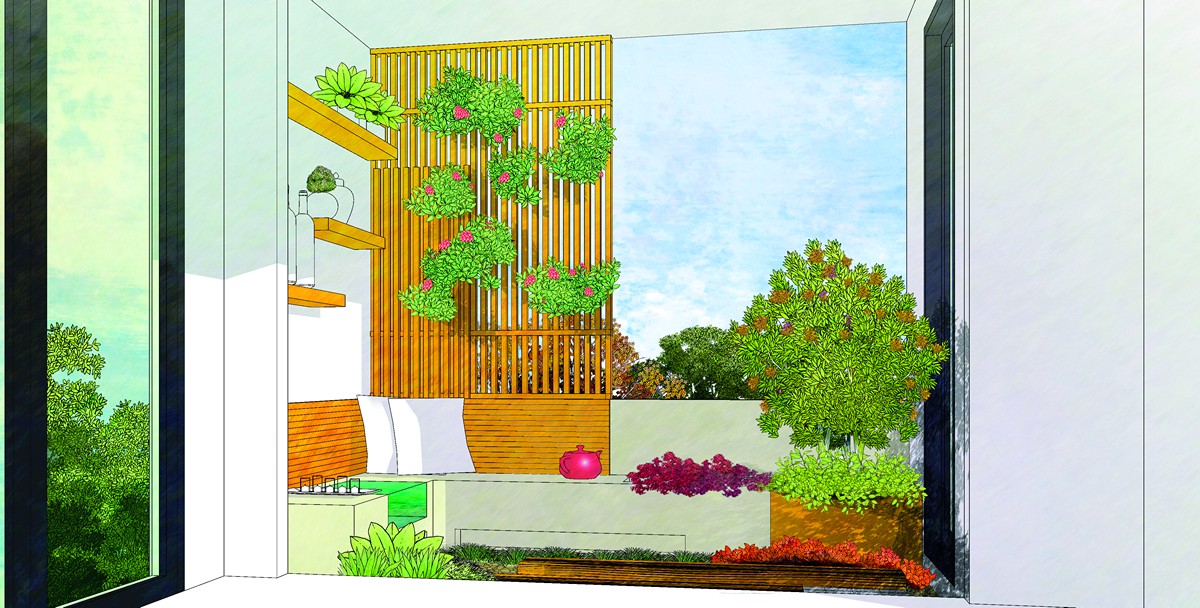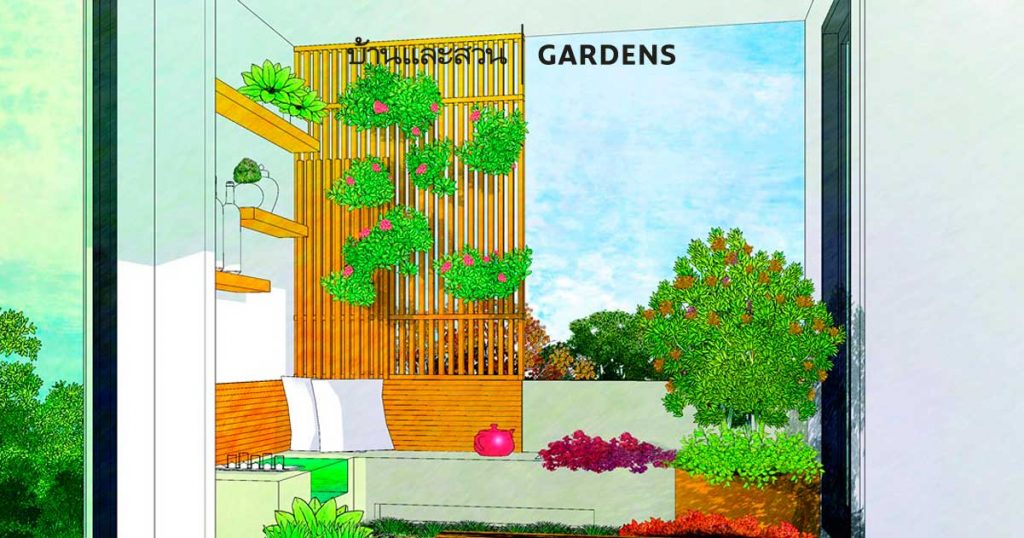 การออกแบบเน้นพื้นที่ใช้งานและสร้างความเป็นส่วนตัวด้วยไม้ระแนงตีเว้นช่องห่าง ให้ดูโปร่งสบายไม่อึดอัด แบบสวนระเบียงสำหรับคอนโด