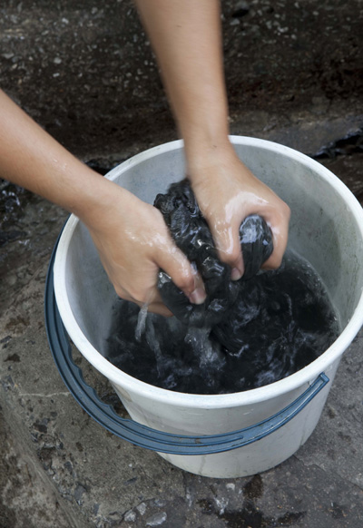 นำผ้าที่ได้มาล้างน้ำสะอาด จนน้ำใส และนำไปตากให้แห้ง หากต้องการสีที่เข้มขึ้น ให้เราทำซ้ำจนกว่าจะได้สีดำที่ต้องการ