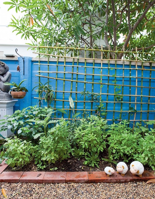 หลังจากได้พูดคุยทำให้ทราบความต้องการเจ้าของบ้านว่าเป็นคนชอบความหลากหลายเลยหยิบเอาจุดเด่นของแต่ละสไตล์สวนจัดวางอย่างละนิดละหน่อย เช่น ซุ้มประตูทางเข้าสวน เลือกใช้บานประตูไม้เก่าล็อกด้วยไม้ขัดแบบโบราณได้อารมณ์แบบสวนไทย ผนังอิฐมอญดินเผาให้ความรู้สึกอบอุ่น ปลูกไม้เลื้อยตามแนวผนังช่วยลดทอนความแข็งของวัสดุได้เป็นอย่างดี