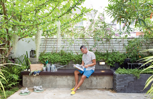 “ตัวบ้านอยู่ริมด้านในสุดทำให้มีพื้นที่รอบบ้านเพิ่มขึ้นมาบ้างเดิมทีก่อนหน้านี้เป็นสวนที่มาพร้อมกับบ้านอยู่แล้ว เหมือนโครงการปกติทั่ว ๆ ไป พอยืนมองดูรอบบ้านเริ่มรู้สึกว่ามันแห้งแล้งไปหน่อย อยากให้มีความรู้สึกร่มรื่นมากกว่านี้ เลยเข้าไปค้นหานักจัดสวนตามเว็บไซต์ต่าง ๆ ค้นไปค้นมาก็ไปเจอภาพผลงานของนักจัดสวนท่านหนึ่ง รูปแบบสวนของเขาส่วนใหญ่ที่เห็นมีต้นไม้เยอะดี และเราเองอยากได้บรรยากาศแบบนี้อยู่พอดี เลยติดต่อให้ คุณศักดิ์ เรืองพร้อมเข้ามาดูพื้นที่และช่วยออกแบบให้เรา ซึ่งอันดับแรกที่เราเน้นมากที่สุดคือ ขอไม้ใหญ่ตามมุมต่าง ๆ ของบ้าน เพราะอยากให้มีพื้นที่ร่มและช่วยบังแดดให้ตัวบ้านชั้นล่างได้ด้วย”