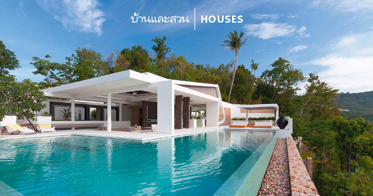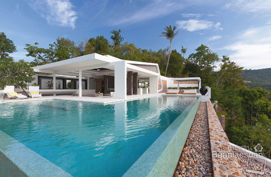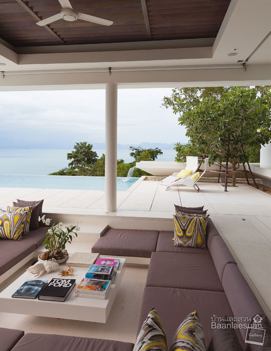 นอกจากภาพของท้องทะเลสุดลูกหูลูกตาเบื้องหน้าจะทำให้บ้านสไตล์โมเดิร์นบนเกาะสมุยหลังนี้มีวิวสวยจนน่าอิจฉาแล้ว การออกแบบภายใต้ข้อจำกัดของลักษณะภูมิประเทศก็เป็นอีกเสน่ห์ที่ทำให้บ้านดูน่าสนใจไม่น้อย