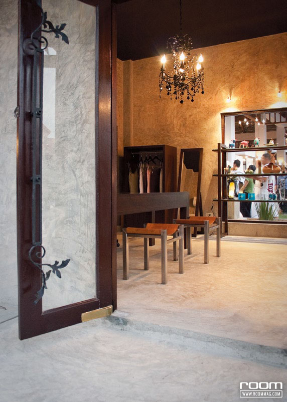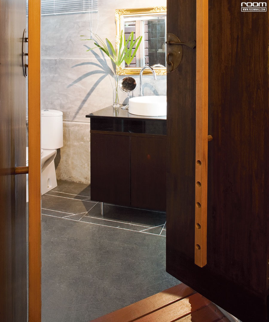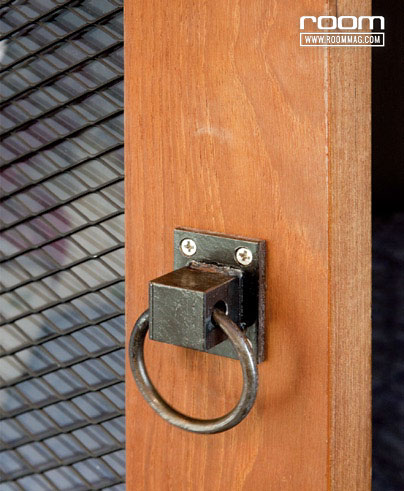 ใช้เหล็กกล่องหน้าตัด 2 x 2 เซนติเมตร ยาว 2 เซนติเมตรมาเชื่อมติดกับแป้นเหล็ก แล้วเจาะรูทั้ง 4 มุมเพื่อยึดนอตติดกับกรอบประตู ส่วนแกนกลางเจาะรูร้อยห่วงกลมไว้เป็นที่จับกระชับมือ แต่งสีให้ดูเก่าด้วยการปัดสีทองสไตล์คลาสสิก ช่วยสร้างบรรยากาศบ้านสไตล์โอเรียนทัล
