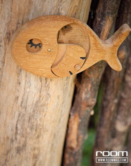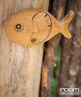 มือจับน่ารักๆ นี้สามารถบอกสถานะของคนในห้องได้ มีเอกลักษณ์อยู่ที่การฉลุแผ่นไม้ให้เป็นรูปปลา เว้นส่วนตาและครีบไว้ เพื่อใช้ประกอบเข้ากับส่วนครีบและตาที่สามารถเลื่อนไป – มาใช้แสดงสถานะหลับและตื่นได้ เป็นอีกไอเดียที่เหมาะกับห้องพักสไตล์รีสอร์ต