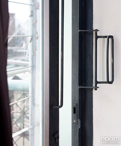 มือจับบานเลื่อนนี้สามารถใช้เปิด – ปิดและเป็นตัวล็อกได้ในตัว ออกแบบมือจับเหล็ก เส้นผ่านศูนย์กลาง5 มิลลิเมตร ดัดเป็นก้านจับถนัดมือ ส่วนวงกบก็มีก้านล็อกเหล็กดัด เชื่อมข้อต่อให้สามารถพับและล็อกได้