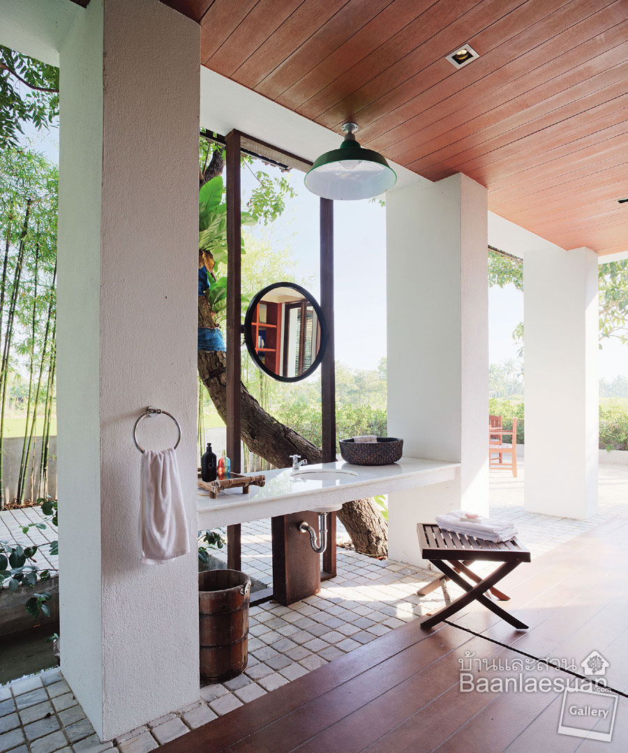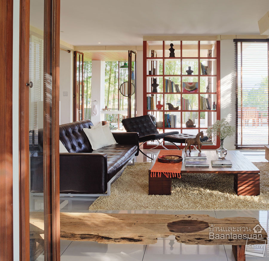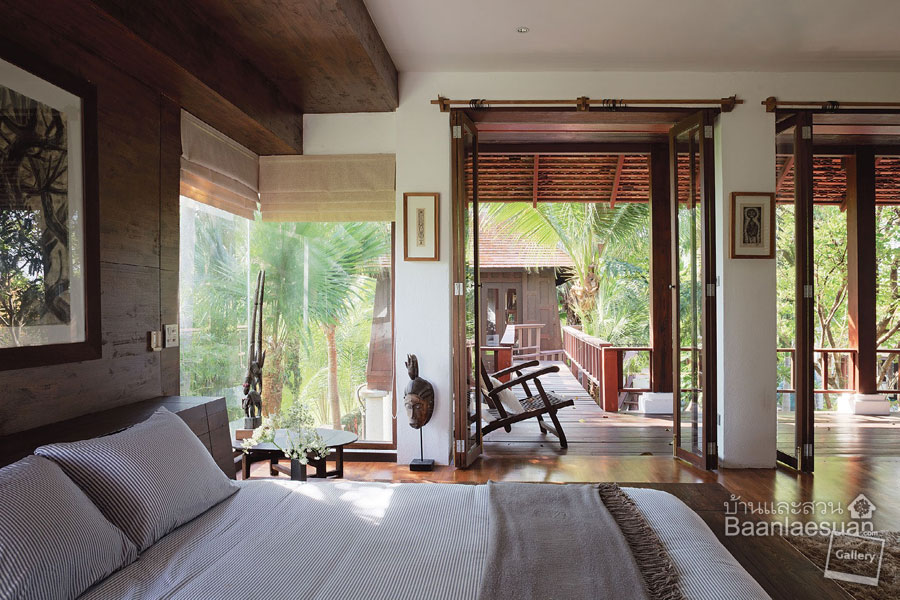 ด้วยความที่คุณอุดมชื่นชอบวัสดุไม้ธรรมชาติเป็นพิเศษ “ไม้จริง” จึงกลายเป็นวัสดุหลักที่ใช้ในการตกแต่งบ้าน รวมถึงโครงสร้างหลักของหลังคาเกือบทั้งหมด ทีเด็ดของบ้านหลังนี้มิใช่แค่การออกแบบ วางผังอาคาร หรือการตกแต่งที่สวยงามเพียงเท่านั้น เจ้าของบ้านยังชื่นชอบและคลุกคลีกกับวงการศิลปะมานานจึงมีโอกาสนำงานศิลปะชั้นดีจากกลุ่มเพื่อนๆที่รู้จักหรือแม้แต่งานศิลปะชั้นครูมาประดับตกแต่งเอาไว้ตามมุมต่างๆในบ้านได้อย่างกลมกล่อม ทั้งงานจิตรกรรมและประติมากรรมในหลากหลายเทคนิค ช่วยเสริมให้บ้านดูมีลูกเล่นน่าค้นหามากยิ่งขึ้น ส่วนช่องเปิดประตูหน้าต่างขนาดใหญ่ก็ทำให้กระแสลมตามธรรมชาติเข้ามาระบายอากาศภายในบ้านได้อย่างสะดวก หลีกเลี่ยงการออกแบบตัวอาคารหลักไม่ให้บดบังทิศทางแดดและลมซึ่งกันและกัน ช่วยให้อยู่สบาย ใช้งานได้ง่ายมากขึ้น