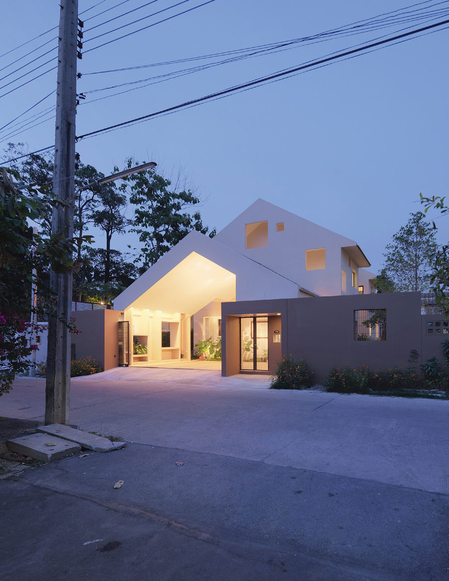 แบบบ้านสไตล์โมเดิร์น หลังคาทรงจั่ว หลังนี้เป็นของนายแพทย์ปภากร และแพทย์หญิงคัคณางค์ มิ่งมิตรพัฒนะกุล ด้วยอาชีพที่ออกห่างจากการออกแบบในสายของการก่อสร้าง เจ้าของบ้านจึงเลือกทำงานร่วมกับสถาปนิกซึ่งมีความสามารถ และที่สำคัญต้องเชื่อใจกันได้