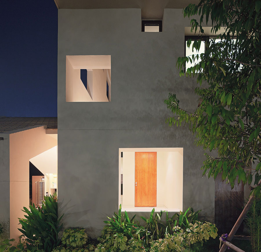 แม้ผนังจะเป็นสิ่งแบ่งแยกพื้นที่เป็นสองส่วนและทำให้เราดูห่างกัน แต่ก็เป็นสิ่งหนึ่งที่ทำให้เกิดความสัมพันธ์ที่พอดี ไม่ใกล้เกินไปและไม่ห่างจนเหงา บ้านหลังนี้คงเป็นเช่นนั้น สร้างผนังเพื่อให้การเจาะช่องเปิดมีความหมาย ปิดบ้าง เปิดบ้าง ดูน่าสนุกและน่าสนใจกว่าเป็นไหนๆ ว่าไหมครับ