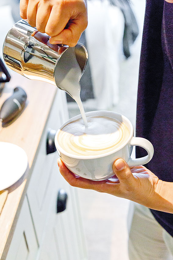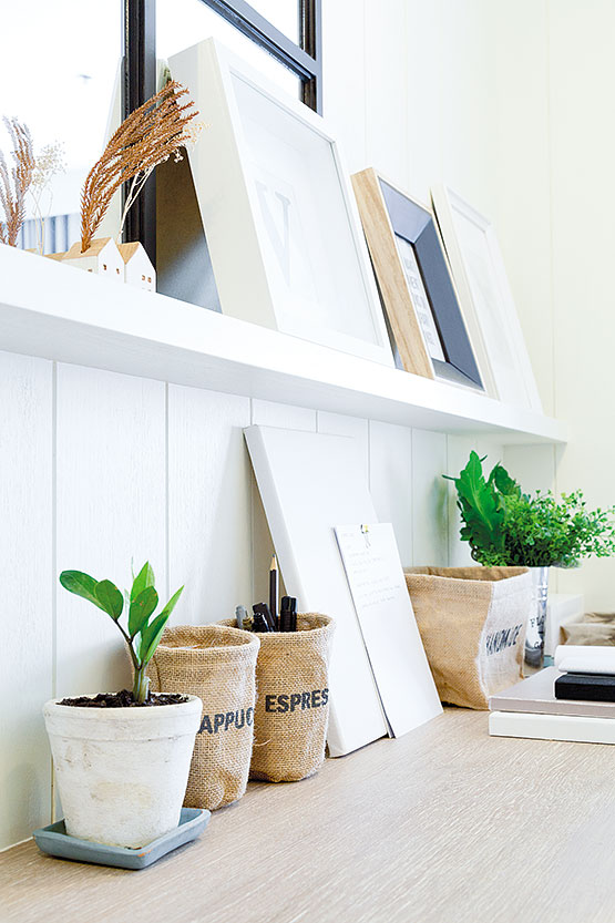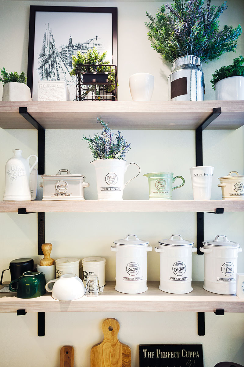 “เมื่อก่อนแว่นชอบมานั่งร้านกาแฟเก๋ๆ ในทองหล่อ แต่พอทำห้องนี้เลยตั้งใจออกแบบให้มีมุมคาเฟ่ในบ้านไว้เลย เพราะแว่นชอบชงกาแฟอยู่แล้วด้วย ก็ค่อยๆ ซื้ออุปกรณ์สะสมมาเรื่อย จนตอนนี้มีครบเลย แถมยังเติมพวกงานเซรามิกสไตล์อังกฤษสีขาวๆ ที่ซื้อจากงานบ้านและสวนแฟร์ที่ผ่านมาเสริมให้มุมคาเฟ่ดูน่ารักขึ้นอีก ยังเคยคิดเลยว่าจะเปิดขายกาแฟในห้องเลยดีไหม เพราะเราชอบชงก็ต้องหาคนมากินบ่อยๆ” คุณแว่นเล่าถึงไอเดียสนุกๆ ขณะทำลาเต้อาร์ตพร้อมเสิร์ฟให้เราชิม