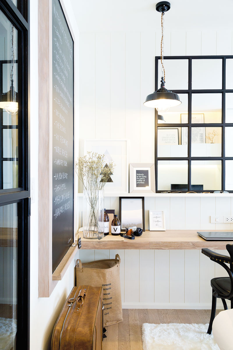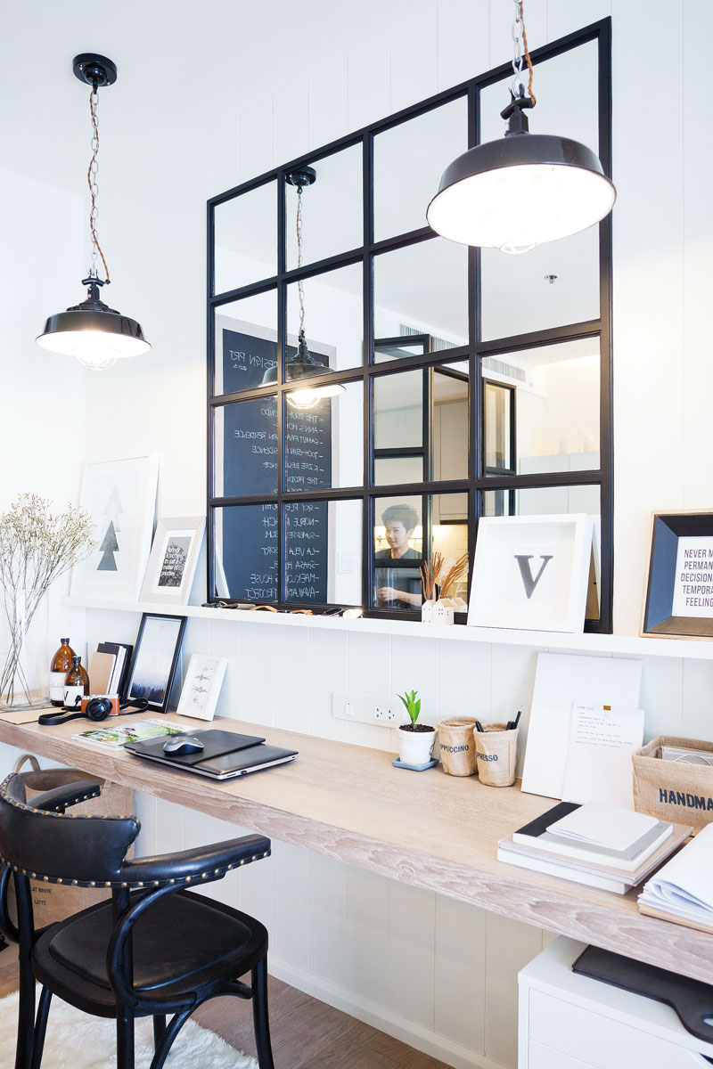 นอกจากชงกาแฟหอมๆ แล้ว คุณแว่นยังเข้าครัวทำอาหารเองอยู่บ่อยๆ ประตูกระจกกรอบเหล็กสีดำจึงเป็นตัวช่วยที่ปิดกั้นเรื่องกลิ่นและควันในครัวไม่ให้ไปรบกวนส่วนพักผ่อนด้านในได้อย่างดี แถมความใสของกระจกก็ยังเปิดมุมมองให้โปร่งสบายตาไปด้วย โดยไอเดียนี้ยังนำมาใช้กับกรอบกระจกใสบานใหญ่ที่ผนังโต๊ะทำงานเช่นกัน ไม่เพียงเชื่อมต่อในเรื่องของดีไซน์ แต่ยังจำลองความรู้สึกของหน้าต่างโปร่งลดความปิดกั้นของผนังทึบลงไปในตัว