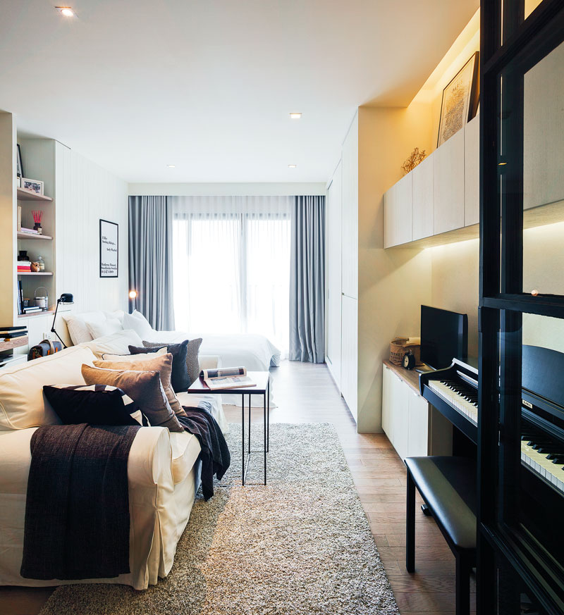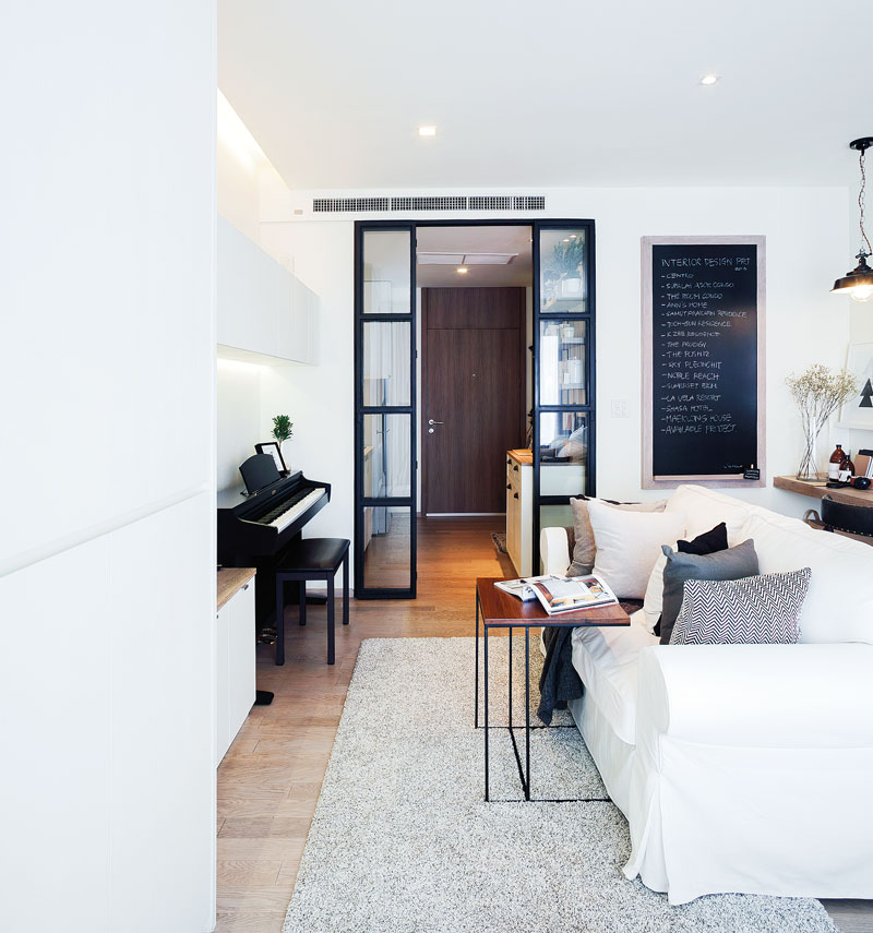 แม้จะอยู่ภายในซอยทองหล่ออันคึกคัก แต่เมื่อค่อนไปทางท้ายซอยก็สัมผัสได้ถึงความเงียบสงบที่แตกต่างจนกลายเป็นข้อดีของที่พักอาศัยสไตล์คอนโดมิเนียมสำหรับคนเมือง ซึ่งทำให้ คุณแว่น-ประภาพร เทนสิทธิ์ มัณฑนากร แห่ง Vinterior Studio เลือกที่จะย้ายออกจากคอนโดเดิม เพื่อหลีกเลี่ยงเสียงรบกวนอันวุ่นวายมาอยู่ในโครงการโนเบิล โซโล ทองหล่อแห่งนี้ โดยเน้น แต่งห้องสีขาว ขนาดเล็กนี้ให้อยู่สบายที่สุด