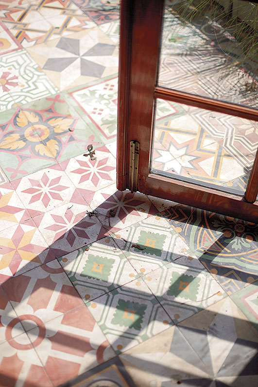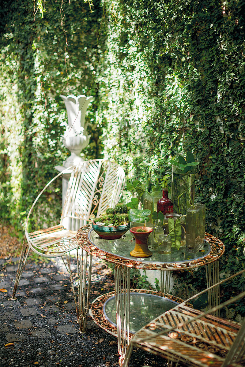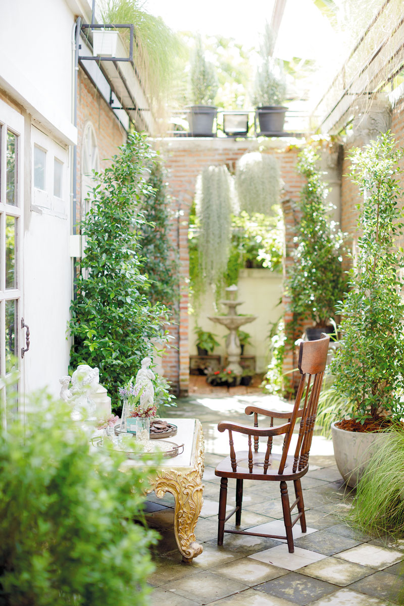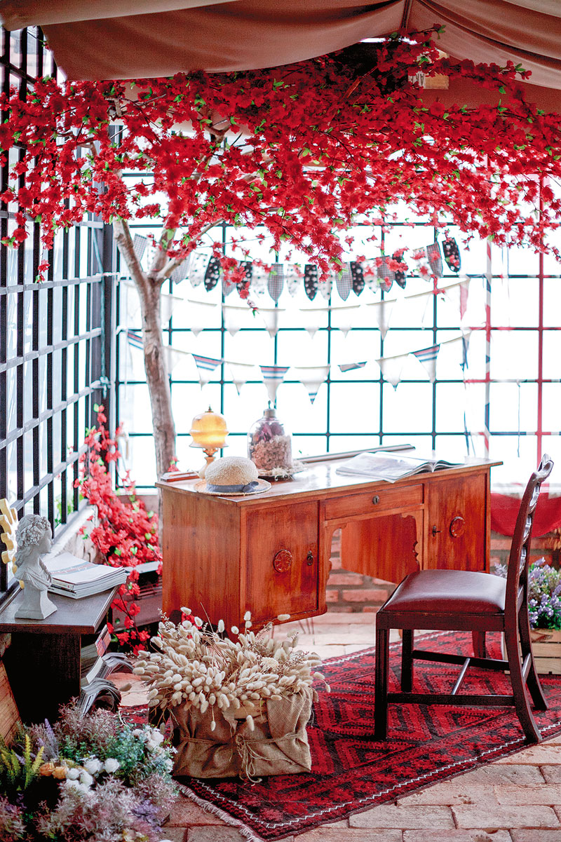 ชั้นสองของบ้านยังคงความน่าสนใจด้วยการใช้สีและเทคนิคการทาที่แตกต่างกันในแต่ละห้อง จุดเด่นอีกอย่างคือการสร้างช่องเปิดรับแสงสว่างจากภายนอกผ่านหน้าต่างกระจกขนาดใหญ่รูปวงกลม นอกจากนี้ระเบียงด้านนอกยังดัดแปลงเป็นมุมนั่งเล่นและจัดปาร์ตี้กึ่งเอ๊าต์ดอร์ได้ โดยติดลูกกรงลายตารางคล้ายช่องหน้าต่างของเรือนกระจก พร้อมตกแต่งด้วยของสะสมในสไตล์มิกซ์แอนด์แมตช์ ด้านนอกระเบียงปลูกไทรเกาหลีล้อมรอบ เพื่อพรางสายตาและสร้างบรรยากาศสีเขียวให้บ้าน