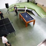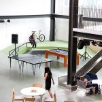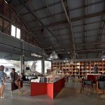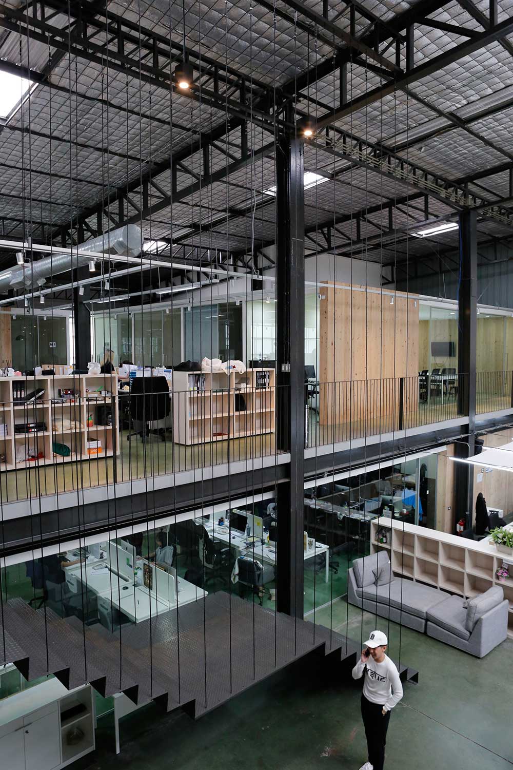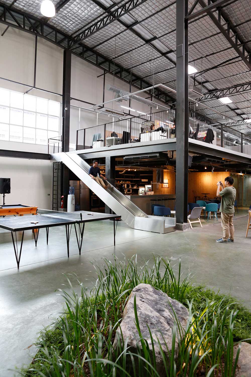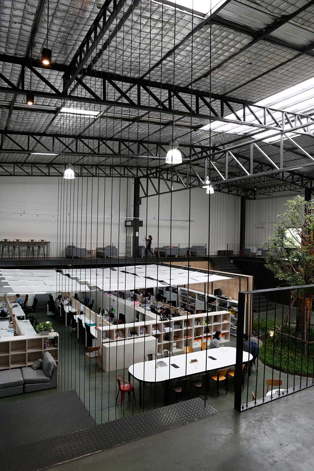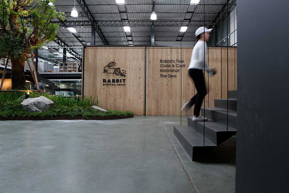 อีกโครงการน้องใหม่ที่เปลี่ยนอาคารโกดังเก่ามาเป็นออฟฟิศสุดชิค ในย่านถนนบรรทัดทองหลังสามย่านกับ The Burrow บ้านโพรงกระต่ายหลังใหม่ของชาว Rabbit Digital Group ผู้สร้างสรรค์งานดิจิทัลมาร์เก็ตติ้ง จากแต่เดิมที่เคยทำงานอยู่ในอาคารสำนักงานทั่วไป เมื่อจำนวนพนักงานมากขึ้น คุณเล็ก-รุ่งโรจน์ ตันเจริญ ผู้บริหาร จึงมองหาสถานที่ใหม่ ด้วยความชอบรูปแบบโกดังอยู่เป็นทุนเดิม เมื่อพบประกาศให้เช่าโกดังอะลูมิเนียมเก่าเก็บจึงลงตัวพอดี เขาตัดสินใจเปลี่ยนโกดังให้กลายเป็นออฟฟิศบนพื้นที่ 1,500 ตารางเมตร โดยมอบหมายให้ MUN Architects มาออกแบบจัดสเปซใหม่ให้เหมาะสำหรับการทำงานที่ต้องคิดสร้างสรรค์ตลอดเวลา โดยเลือกคงโครงสร้างแบบโกดังเอาไว้และกรุฉนวนอะลูมิเนียม พื้นคอนกรีตสีเขียวตุ่นของเดิม ส่วนเสาเหล็กเดิมเป็นสีเทาก็ทาสีดำทับ และตกแต่งไม้เพิ่มเติมสร้างบรรยากาศอบอุ่นดูสะอาดตา ตรงกลางเปิดพื้นที่เป็นมุมสาธารณะจัดวางโต๊ะอเนกประสงค์ มีมุมให้เล่นกีฬาในร่มอย่างโต๊ะพูล ลานสเก็ตบอร์ดและปิงปองทำให้พนักงานเกิดปฏิสัมพันธ์ระหว่างกันในออฟฟิศ ด้านหน้าวางต้นไม้ใหญ่ช่วยเพิ่มพื้นที่สีเขียวภายในอาคารทำให้บรรยากาศดูผ่อนคลายขึ้น บนหลังคายังกรุช่องแสงเป็นระยะ เช่นเดียวกับช่องแสงข้างโกดังทำให้ภายในบริเวณดูสว่างจนแทบไม่ต้องเปิดไฟตอนกลางวัน ส่วนพื้นที่ทำงานออกแบบให้ค่อนข้างเปิดโล่งไม่กั้นผนังชัดเจน แต่ใช้วิธีแบ่งโซนด้วยชั้นหนังสือหรือพาร์ทิชันเตี้ยทำให้พื้นที่ไม่ดูตัดขาดจากกัน