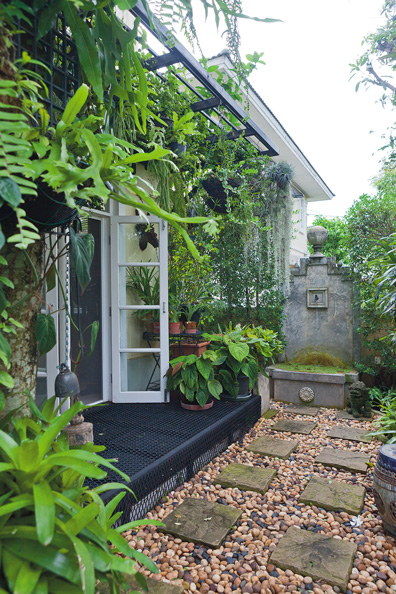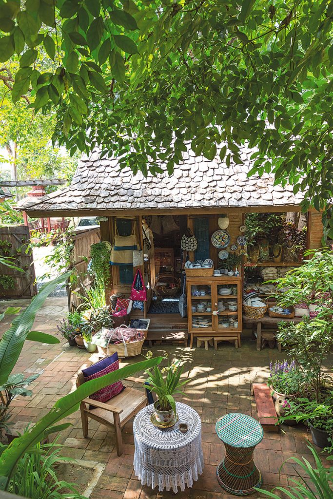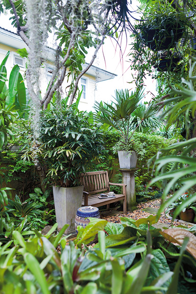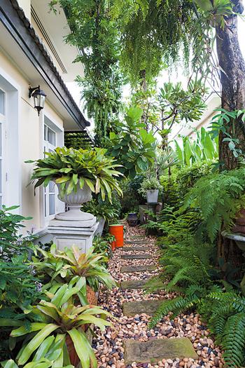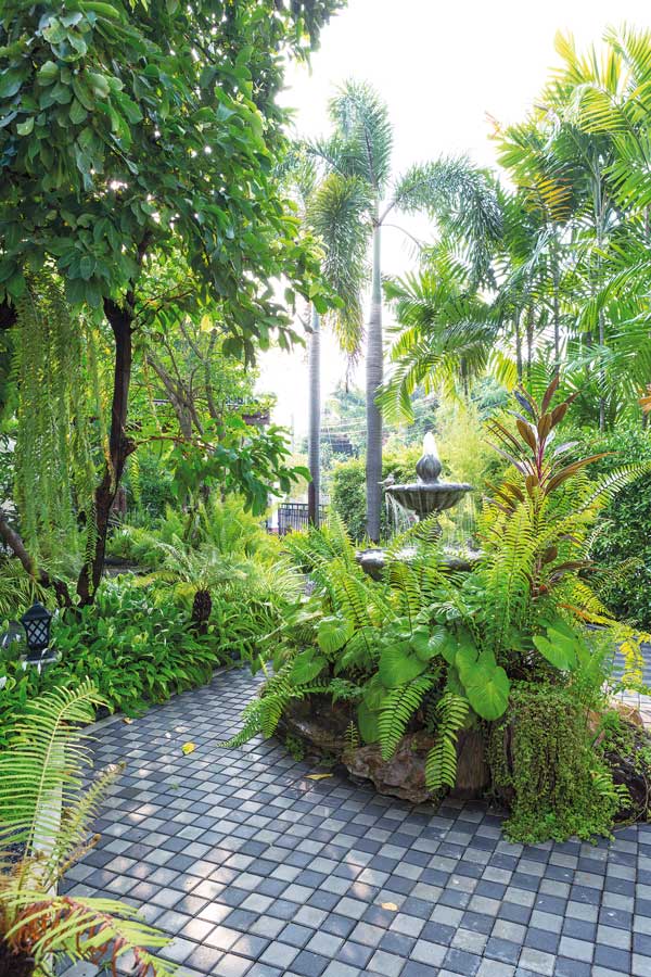 ด้วยความชื่นชอบการจัดสวนอยู่เสมอของเจ้าของบ้านจึงเนรมิตพื้นที่บริเวณรอบบ้านที่มีระยะห่างจากตัวบ้านแค่ไม่เกิน 3 เมตรให้กลายเป็นสวนทรอปิคัล โดยใช้พรรณไม้เขตร้อนอย่างเฟิน สับปะรดสี ผสมผสานกับของตกแต่งสไตล์ลอฟต์และแอนทีคได้อย่างลงตัว พร้อมทำทางเดินโรยกรวดแม่น้ำสลับกับแผ่นทางเดินหินทรายช่วยเพิ่มสีสันให้สวน