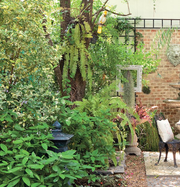 “เดิมทีแรกมองเข้ามาภายในสวนจะเห็นกำแพงสูงราวๆ สี่เมตรซึ่งมองแล้วก็ทำให้รู้สึกอึดอัด มีห้องเรือนกระจกซึ่งใช้งานจริงอาจจะต้องเปิดเครื่องปรับอากาศช่วยในช่วงกลางวัน ตรงนี้ผมแก้ไขด้วยการปลูกไม้ใหญ่เพิ่มเข้าไปสร้างร่มเงาให้กับบริเวณนี้ ลดการสะท้อนแสงทำให้อุณหภูมิบริเวณนี้เย็นขึ้นมาบ้าง ติดกับเรือนกระจกจะเห็นแท่นปูนปูกระเบื้องลายโบราณเตรียมไว้เป็นฐานวางศาลพระภูมิ ผมเลยขอคำปรึกษาจากเจ้าของบ้านว่าพอจะมีวิธีเปลี่ยนตำแหน่งการวางได้บ้างไหม เพื่อให้ภาพรวมของสวนร้อยเรียงไปในทิศทางเดียวกัน เป็นมุมที่ผมเองตั้งใจเอาไว้แล้วว่าเหมาะที่จะทำมุมนั่งพักผ่อน เพราะมีร่มเงาของไม้ใหญ่อยู่แล้ว และเป็นจุดไฮไลต์ของสวนนี้เลยก็ว่าได้ หลังจากที่คุยกับผู้เชี่ยวชาญก็ได้มีการย้ายตำแหน่งศาลไปอยู่ในบริเวณที่ลงตัวทั้งกับบ้านและสวน”