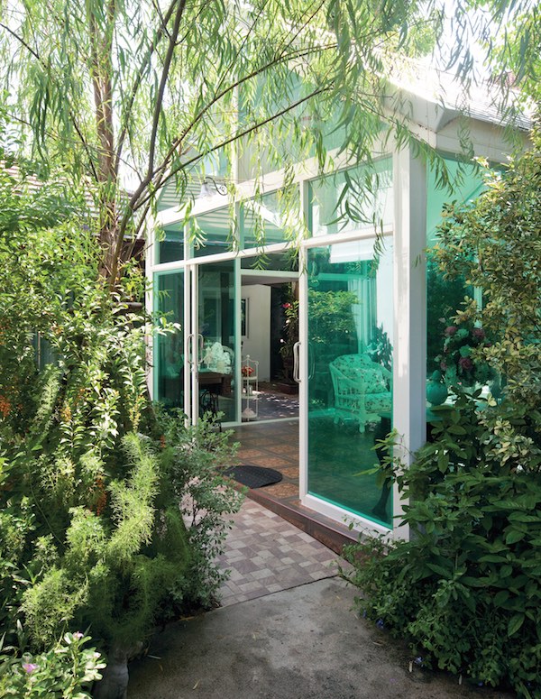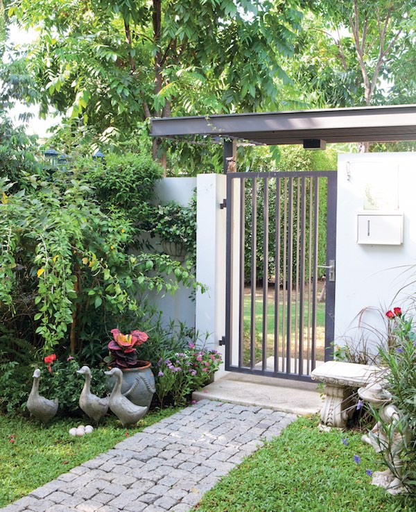 “ บ้านนี้เรามีสมาชิกกันหลายคน รวมถึงคุณตาคุณยายด้วยท่านทั้งสองอายุมากแล้วอาจจะเดินเองลำบาก โดยส่วนใหญ่จะใช้รถเข็นเวลาไปไหนมาไหนในบริเวณรอบบ้าน เลยออกแบบต่อเติมระเบียงพื้นไม้และห้องเรือนกระจกให้เป็นมุมพักผ่อน และรองรับกิจกรรมต่างๆ ท่ามกลางต้นไม้ที่ล้อมรอบซึ่งวางแผนจัดเตรียมพื้นที่เอาไว้ก่อนจัดสวน มีทางสโลปผ่านหน้าเรือนกระจกเป็นทางสัญจรที่ใช้งานได้ทุกคน รวมถึงคุณตาคุณยายจะได้ใช้งานสะดวกมากขึ้น เหลือเพียงสวนที่ยังดูไม่ร่มรื่นสักเท่าไรจึงอยากเติมเต็มเพื่อให้บรรยากาศของบ้านดูเป็นธรรมชาติ เราเริ่มค้นหาข้อมูลเกี่ยวกับสวนที่เราอยากได้จนเปิดไปเจอผลงานคุณศักดิ์ เรืองพร้อม นักจัดสวน จากในหนังสือแต่งบ้านเลยติดต่อให้เขามาช่วยดูพื้นที่ทำสวนให้หน่อย เพราะดูจากผลงานสไตล์การจัดสวนตรงกับความชอบของเราพอดิบพอดี ”