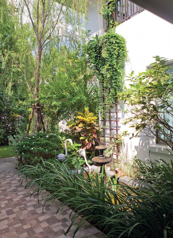 “หลังจากนั้นก็เริ่มทำด้านหลังมุมโปรดของน้องชายเป็นผนังสวนแนวตั้ง โดยให้เขามีส่วนร่วมในการเลือกพรรณไม้ที่เขาชอบมาปลูกในบริเวณนี้ เป็นที่ร่มรำไรเหมาะกับพืชประเภทเฟินบีโกเนีย กล้วยไม้ พรมญี่ปุ่น ต่อมาตอบโจทย์ของคุณพ่อด้วยตำแหน่งบ่อน้ำที่วางไว้หน้าห้องเรือนกระจกโดยมีระแนงไม้เลื้อยที่กำแพง ใส่อ่างน้ำล้นขนาดเล็ก เมื่อมองออกมาจะเห็นความเคลื่อนไหวของน้ำ พอเปิดประตูออกก็จะได้ยินเสียงน้ำเบาๆทำให้รู้สึกผ่อนคลาย ทางเดินหรือทางสัญจรต้องคำนึงถึงสมาชิกในบ้านทุกคน ทำเป็นพื้นทรายล้างกันลื่นและมีความแข็งแรงมั่นคงต่อการเหยียบย่ำสำหรับบ้านที่มีผู้สูงวัยอยู่ด้วย ส่วนสุดท้ายมีสเปซว่างบริเวณหน้าบ้านทำเป็นลานสนามหญ้าสำหรับน้องหมา ในส่วนนี้จึงเปิดโล่งรับลมได้ตลอดทั้งวัน ส่วนเรื่องการใช้พรรณไม้ ผมดูตำแหน่งการวางต้นไม้ใหญ่ที่ให้ร่มเงา ในขณะเดียวกันต้องโปร่งพอให้มีแสงส่องลงมายังไม้พุ่มด้านล่างได้ด้วย ”
