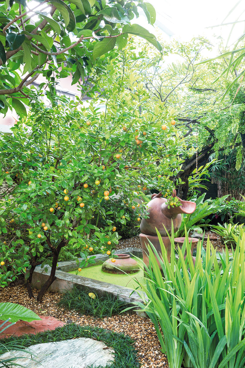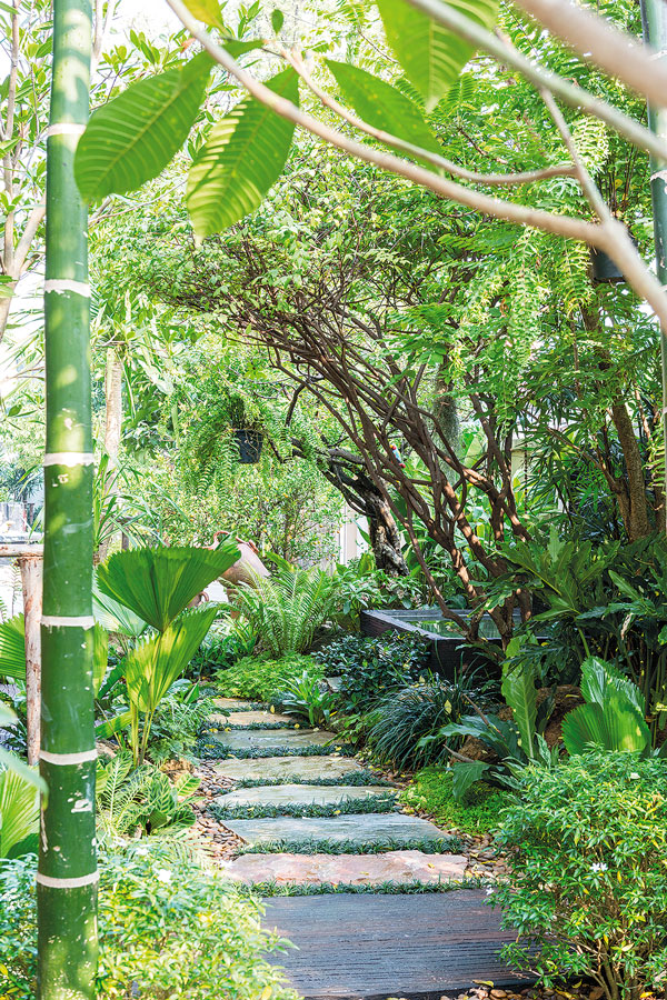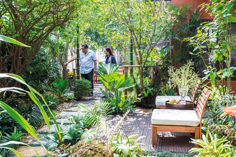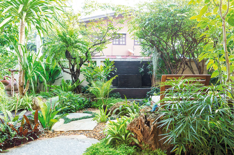 “การจัดสวนจะต้องเข้าใจนิสัยต้นไม้แต่ละชนิด ไม้ใหญ่ส่วนใหญ่ชอบแดดจัด เราจึงควรเลือกไปไว้ตามขอบสวน เพื่อให้ต้นไม้เหล่านั้นเจริญเติบโตและได้รับแสงแดดเต็มที่ ทีนี้พอมีต้นไม้ใหญ่ก็จะเกิดร่มเงา ต้องหาต้นไม้ที่ชอบแสงแดดน้อยกว่าปลูกไว้ด้านล่างและตรงกลางสวน” คุณสุรินทร์เล่า