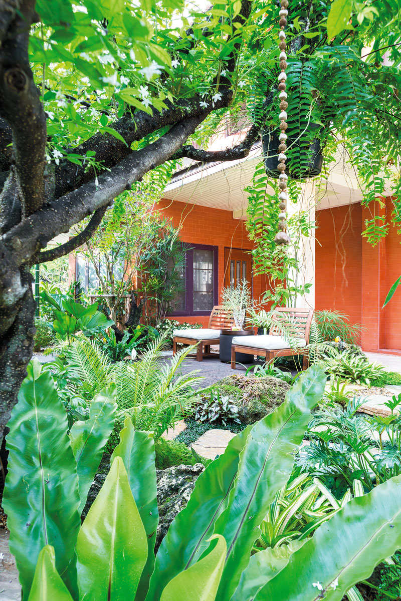 สวนรอบบ้านคุณพ่ออยู่ติดกับลานจอดรถ ซึ่งทางเดินเข้าบ้านเป็นพื้นคอนกรีตที่เรียบ เหมาะสำหรับการเดินของผู้สูงอายุ ขณะเดียวกันการเลือกพรรณไม้ก็มีไม้ยืนต้นขนาดใหญ่ไม่กี่ต้นสำหรับให้ร่มเงาและไม้กระถางตกแต่งให้มีลักษณะคล้ายตอไม้ในธรรมชาติ เข้ากับสวนบริเวณอื่นซึ่งจัดเป็นสวนป่าที่ร่มรื่นไม่แพ้กัน อย่างทางเข้าบ้านคุณโต้งและคุณมะแหม่มซึ่งครึ้มไปด้วยไม้ใหญ่แทรกไปกับไม้พุ่มและไม้คลุมดิน ซึ่งเป็นไม้พื้นถิ่นที่พบเห็นได้ทั่วไปและดูแลไม่ยากมาก อย่างขิงแดง เฟินข้าหลวงหลังลาย เฟินรัศมีโชติ คล้าชนิดต่างๆ และหมากผู้หมากเมีย แทรกไปกับไม้ผลอย่างชมพู่ม่าเหมี่ยวและส้มจี๊ด เดิมสวนบริเวณนี้มีเพียงบ่อน้ำและระเบียงไม้ที่โครงเริ่มพุพัง จึงถูกรื้อใหม่ให้เหลือเพียงบ่อเลี้ยงปลา เพิ่มผนังน้ำตกสำหรับให้เสียงน้ำ สร้างบรรยากาศเป็นธรรมชาติยิ่งขึ้น ปกคลุมด้วยไม้ใหญ่ให้ร่มเงาแก่บ้าน ขณะเดียวกันก็แทรกไม้ดอกในส่วนที่สามารถรับแสงแดดได้พอสมควร เช่น ไอริสน้ำ โมก พุดศุภโชค กล้วยไม้ดิน และเดหลีใบมัน