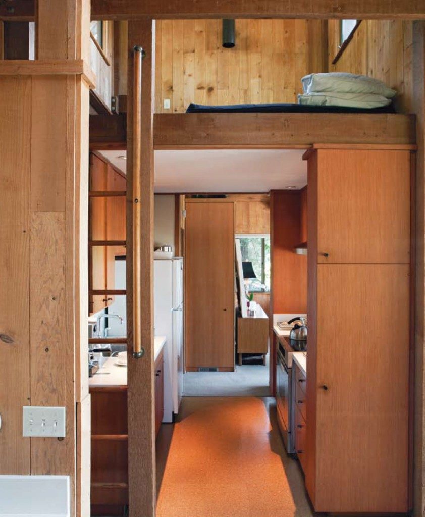 ห้องนอนเล็กๆ 2 ห้อง และครัวโปร่งกลางบ้าน นอกนั้นเป็นพื้นที่โปร่งแบ่งเป็นส่วนนั่งเล่น ส่วนรับประทานอาหาร สีส้มและดำซึ่งเป็นโทนสีหลักในตกแต่งดูเท่ทันสมัยกลมกลืนไปกับโทนสีของไม้ และพื้นบางส่วน เมื่อแสงธรรมชาติมาตกกระทบก็ช่วยเพิ่มสีสันและความรู้สึกอบอุ่นน่าพักผ่อน