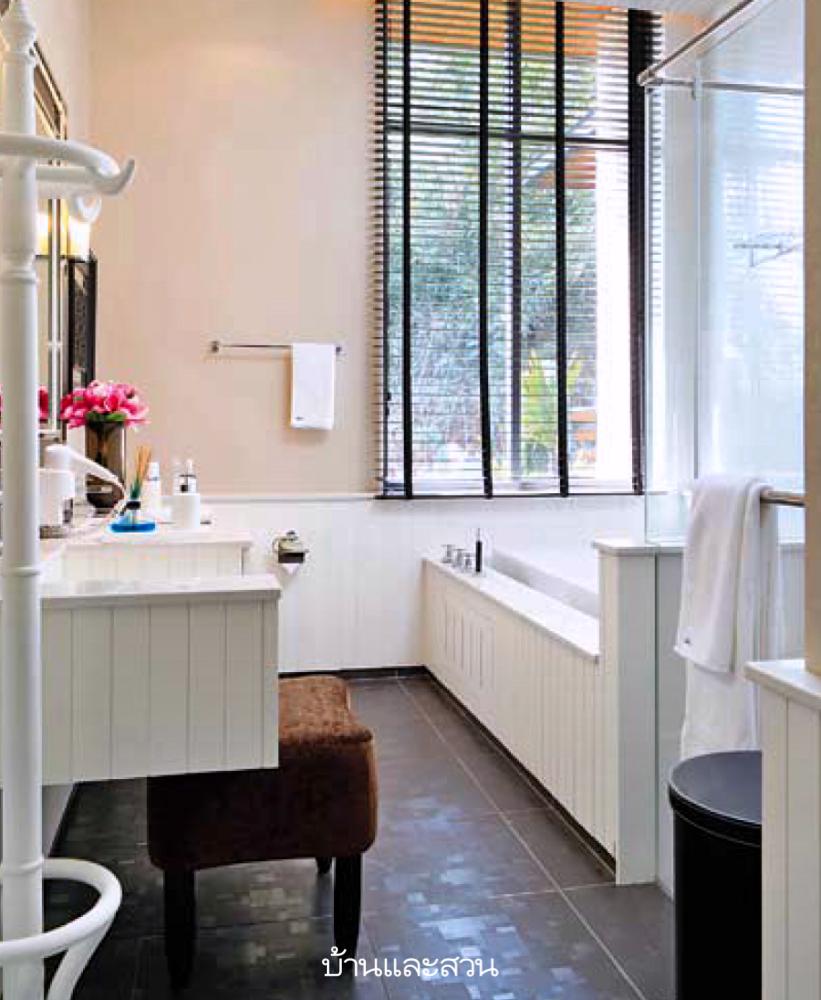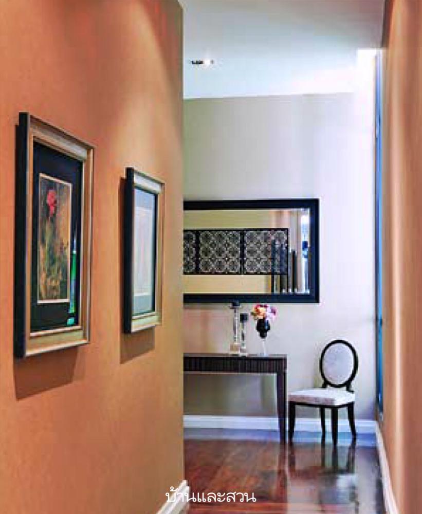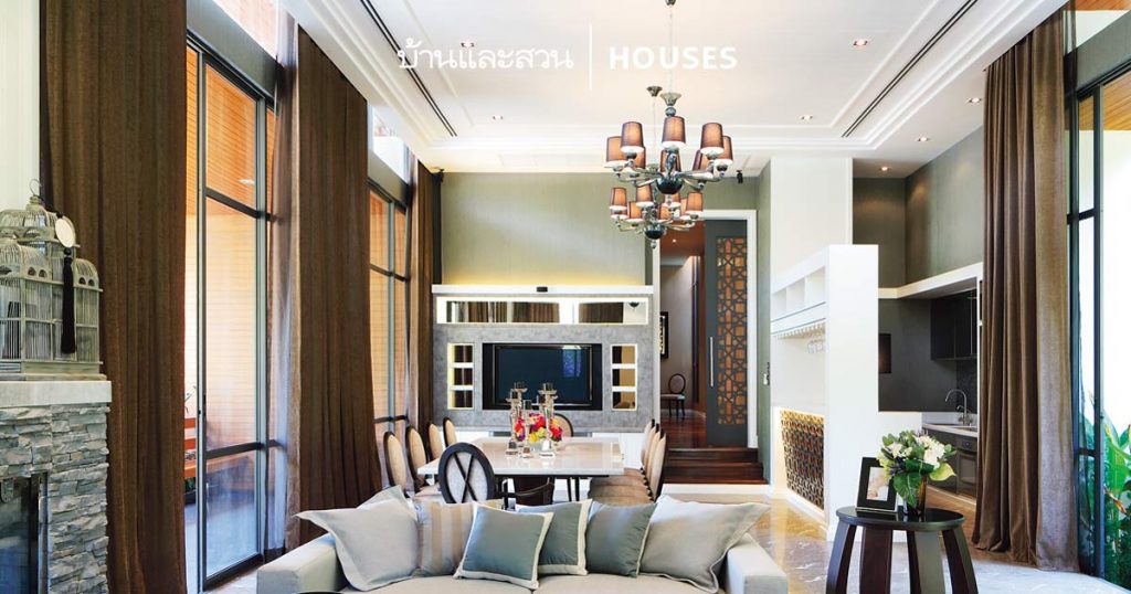 ภายในบ้านตกแต่งสไตล์อเมริกันคลาสสิกแบบโมเดิร์น เน้นเส้นสายที่ค่อนข้างเรียบ ทุกห้องมีระดับเพดานสูงได้ความสง่างาม ใช้เฟอร์นิเจอร์แบบคลาสสิกที่ตัดทอนให้มีความเรียบง่ายขึ้นคุมโทนด้วยสีกลางคละน้ำหนักอ่อนแก่กันไป เช่น เบจ เทา ครีม และน้ำตาล