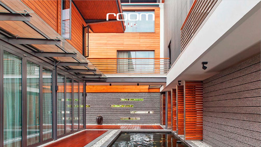 เชื่อมต่อมุมมองจากชั้นบนลงมาสู่ชั้นล่างด้วยกันสาดแบบโปร่งใส โดยการติดตั้งโครงอะลูมิเนียมอบสีดำยื่นออกจากแนวผนังเดิม 1 เมตร แล้วกรุกระจกใสซึ่งเป็นเทคโนโลยีนาโนเคลือบผิวกระจกเพื่อป้องกันนกเกาะ ทำความสะอาดได้ง่าย เหมาะกับบ้านหลายสไตล์ไม่ว่าจะเป็นโมเดิร์นหรือทรอปิคัล