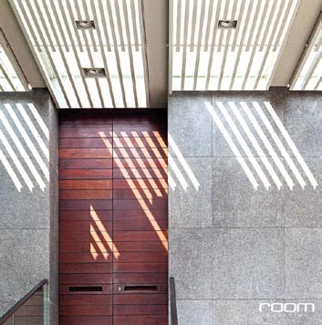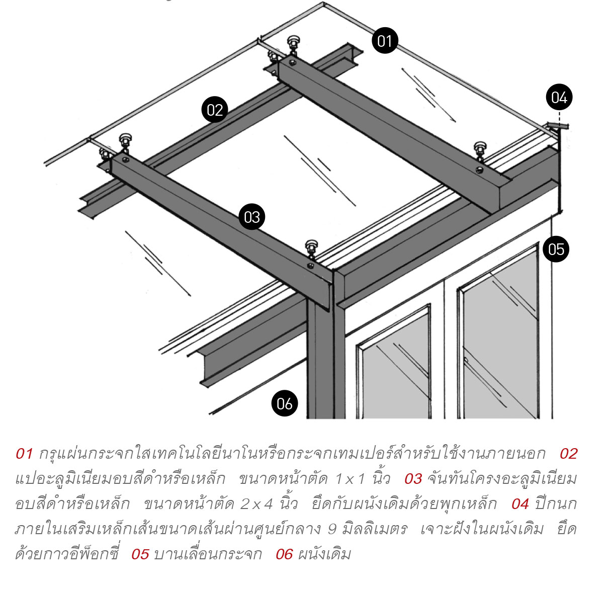 เชื่อมต่อมุมมองจากชั้นบนลงมาสู่ชั้นล่างด้วยกันสาดแบบโปร่งใส โดยการติดตั้งโครงอะลูมิเนียมอบสีดำยื่นออกจากแนวผนังเดิม 1 เมตร แล้วกรุกระจกใสซึ่งเป็นเทคโนโลยีนาโนเคลือบผิวกระจกเพื่อป้องกันนกเกาะ ทำความสะอาดได้ง่าย เหมาะกับบ้านหลายสไตล์ไม่ว่าจะเป็นโมเดิร์นหรือทรอปิคัล