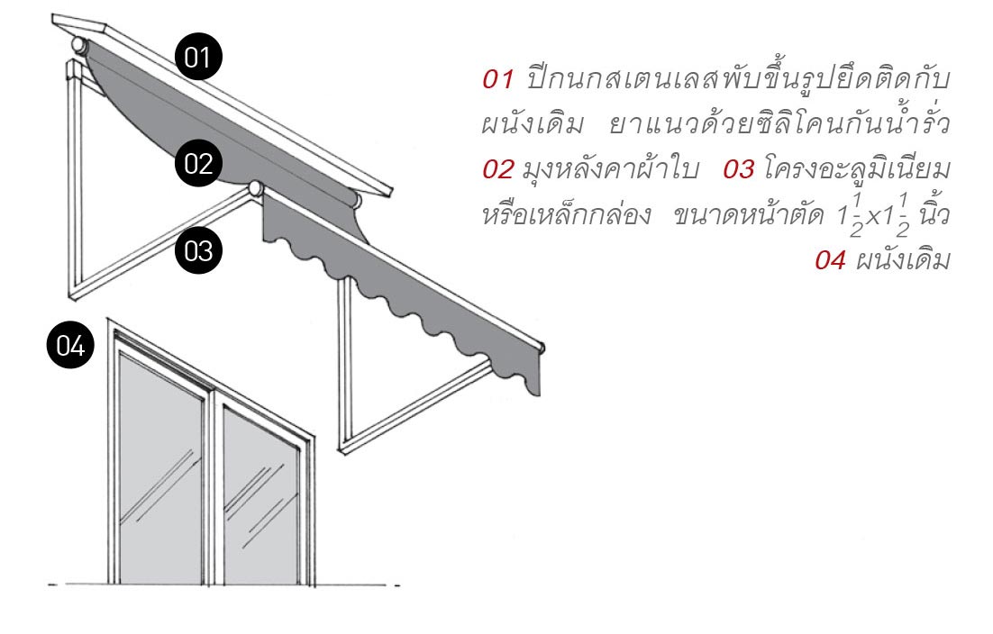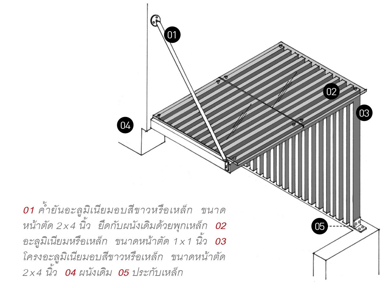 ติดตั้งกันสาดโครงเหล็ก ขนาด 1 x 1 นิ้ว เป็นแนวยาวจากหลังคาลงมาจนจรดเป็นผนังด้านหนึ่ง ยึดหลังคากับผนังด้วยค้ำยันโครงเหล็ก ขนาดหน้าตัด 2 x 4นิ้ว ตรึงด้วยพุกเหล็ก หากต้องการป้องกันน้ำฝน แนะนำให้ติดตั้งแผ่นพอลิคาร์บอเนตแบบใสเหนือแนวระแนง สามารถเลือกการส่องผ่านของแสงได้ตามความหนาของแผ่นตั้งแต่ 6, 8 และ 10 มิลลิเมตร