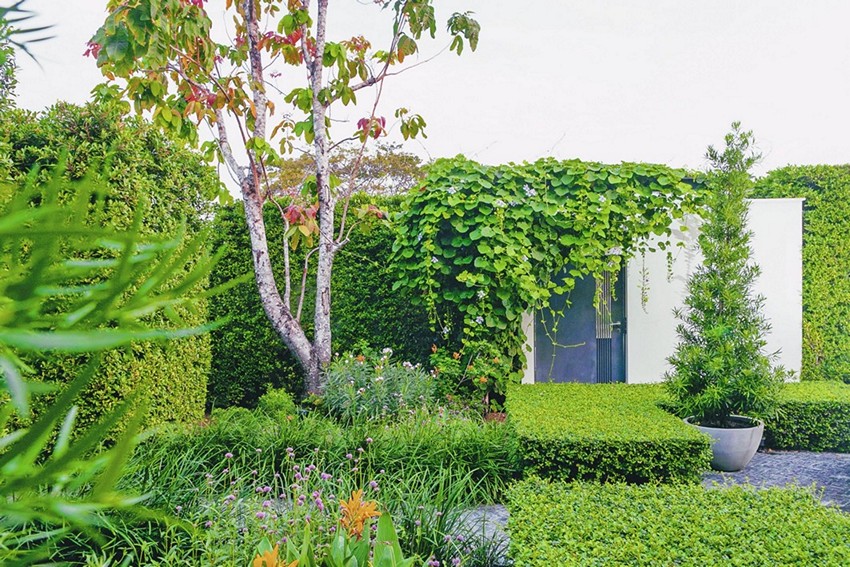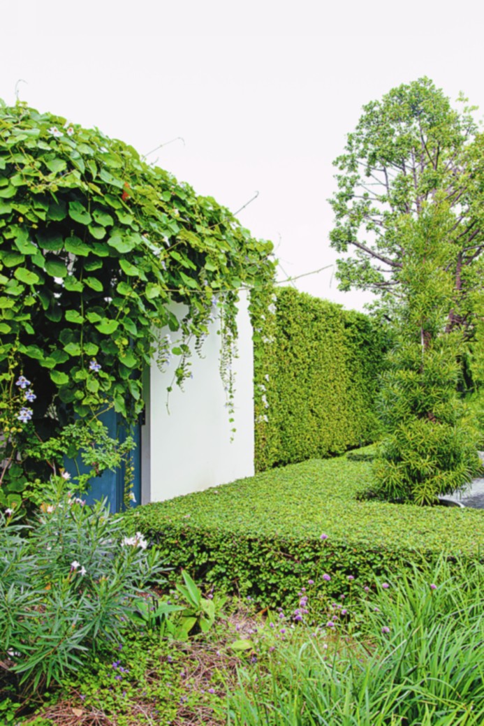 ประกอบกับไลฟ์สไตล์และความชอบของเจ้าของบ้านที่ชอบแนวเรียบหรู จึงคิดว่าสวนลักษณะนี้น่าจะเหมาะกันอีก ทั้งพื้นที่สวนด้านหน้าบ้านค่อนข้างกว้างจึงออกแบบสวนให้มีผนังต้นไม้กั้นแบ่งพื้นที่ออกเป็นห้องเล็ก ๆ อย่างเป็นสัดส่วนเพื่อสร้างความรู้สึกส่วนตัวแบบไม่ปิดทึบ อีกทั้งเมื่อยืนอยู่ในแต่ละจุดจะเห็นมุมมองที่ต่างกันและจะไม่เห็นภาพสวนทั้งหมด ซึ่งเพิ่มความมีเสน่ห์ น่าค้นหา