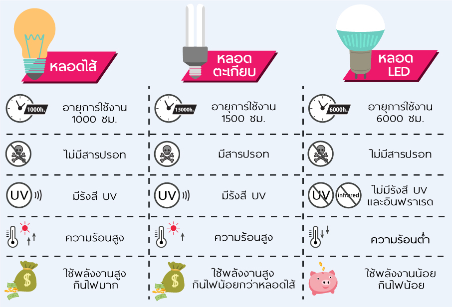 ตารางเปรียบเทียบคุณสมบัติของหลอดไฟ