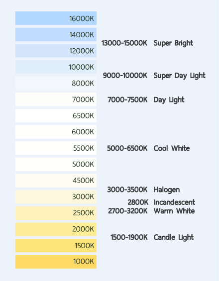 ทั้งนี้อุณหภูมิสี (Color Temperature) ของแสงจากหลอดไฟมีหน่วยเป็นเคลวิน (Kelvin) โดยอุณหภูมิสีจะบอกเราได้ว่าแสงที่ได้มีความขาวบริสุทธิ์มากน้อยแค่ไหน ถ้าหลอดไฟมีค่าอุณหภูมิสีของแสงน้อย แสงที่ได้จะออกมาในโทนสีเหลือง แต่ถ้าค่าอุณหภูมิสีของแสงสูงขึ้น แสงที่ได้จะออกมาในโทนสีขาวหรือสีขาวอมฟ้า