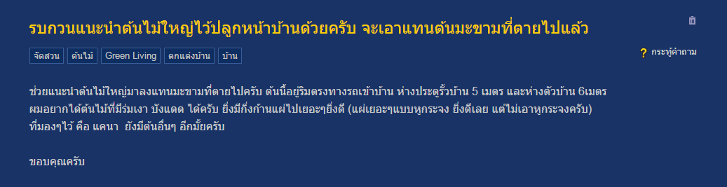 บ้านและสวนคลายข้อสงสัย หยิบกระทู้พันทิปที่ถามกันเกี่ยวกับเรื่องบ้าน และเรื่องสวน ซึ่งในสัปดาห์นี้มีปัญหาหนึ่งที่น่าสนใจ ดังนี้ ต้นไม้ใหญ่