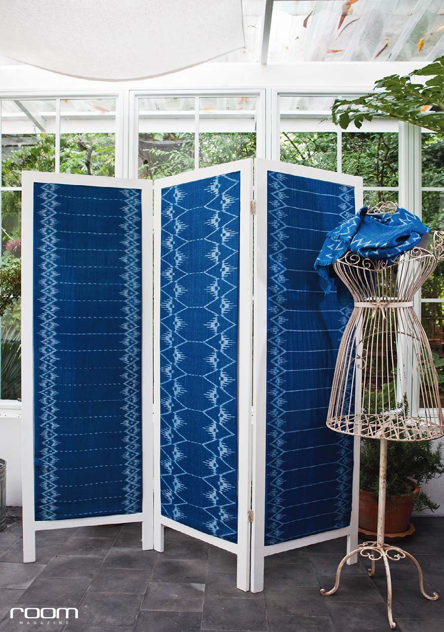 ไอเดียนี้อาจถูกใจคนรุ่นใหม่ที่มีพื้นที่ห้องจำกัด และอยากได้ฉากกั้นสวย ๆ เพื่อแบ่งพื้นที่ใช้สอยให้ชัดเจนขึ้น ลองเริ่มจากการหาฉากไม้ตัวหลักสักอัน จะซื้อแบบทำสำเร็จแล้วหรือจะสั่งทำตามขนาดที่ต้องการก็ได้ (ส่วนใหญ่เป็นแบบบานพับ 3 – 4 บานขนาดความสูงประมาณ 160 เซนติเมตร และกว้าง 50 – 60เซนติเมตร) จากนั้นนำฉากที่ได้มาทาสีให้เข้ากับห้องและเฟอร์นิเจอร์ หรือจะโชว์สีไม้ให้ดูเป็นธรรมชาติก็ดูเข้าที โดยครั้งนี้เราขอเลือกทาสีขาวเพื่อเป็นตัวอย่าง ก่อนจะนำผ้าย้อมครามลายกราฟิกและลายไทยดั้งเดิมที่เลือกลายไว้มาขึงลงไปแล้วยึดด้วยตะปูหมุดเล็ก ๆ ให้สวยงาม ถ้าอยากให้ทันสมัยอาจเลือกใช้ผ้าสีล้วนมาผสมด้วยก็ให้ลุคชิค ๆ ไปอีกแบบ รับรองว่า ผนังฉากกั้นลายผ้าไทยจากไอเดียนี้จะช่วยสร้างสีสันให้ห้องคุณได้อย่างลงตัวแน่นอน
