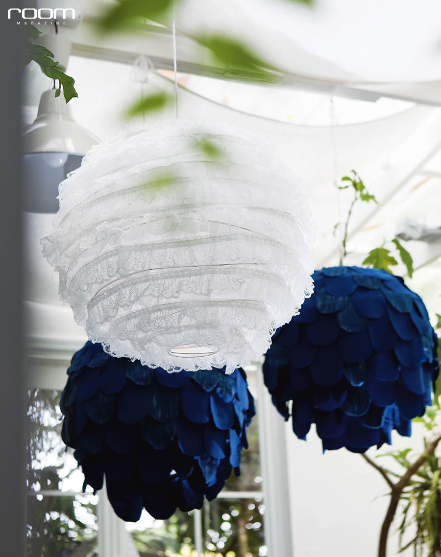 GOOD IDEAS : ผ้าย้อมครามมีสีเข้มและมีความหนาพอสมควร จึงทำให้แสงไฟที่ลอดผ่านออกมามีแสงสลัวๆ หากต้องการให้ แสงไฟสว่างขึ้น ควรเลือกใช้ผ้าไทยสีอ่อนชนิดอื่นหรือแขวนโคมหลายๆ ดวงไล่ระดับลดหลั่นกันไปมา ก็ช่วยเพิ่มแสงสว่างและมิติให้ห้องไปอีกแบบ