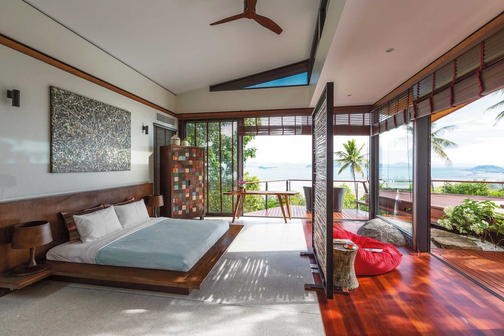 ห้องนอนใหญ่ กลิ่นอายของสไตล์ซาฟารีและลอฟต์ที่ผสมผสานกันอย่างกลมกลืน ในความดิบของปูนเปลือยมีไม้ที่ดูอบอุ่นเป็นตัวเชื่อมต่อ รวมถึงเฟอร์นิเจอร์ที่ใช้วัสดุธรรมชาติรูปทรงฟรีฟอร์ม และสีสันสดใสในโทนคู่สีตรงข้าม ก็ช่วยเพิ่มความน่าสนใจ ทำให้บ้านดูไม่น่าเบื่อ ปล่อยเปลือยโครงสร้างเพื่อรับแสงด้านข้าง ด้วยผนังสามด้านเป็นกระจกใส ที่มองเห็นวิวได้สวยงาม จุดเด่นของห้องนี้คือมีหินก้อนกลมขนาดใหญ่ตั้งอยู่หน้าห้อง จึงออกแบบเป็นระเบียงรูปทรงกลมวางบนหินอีกที